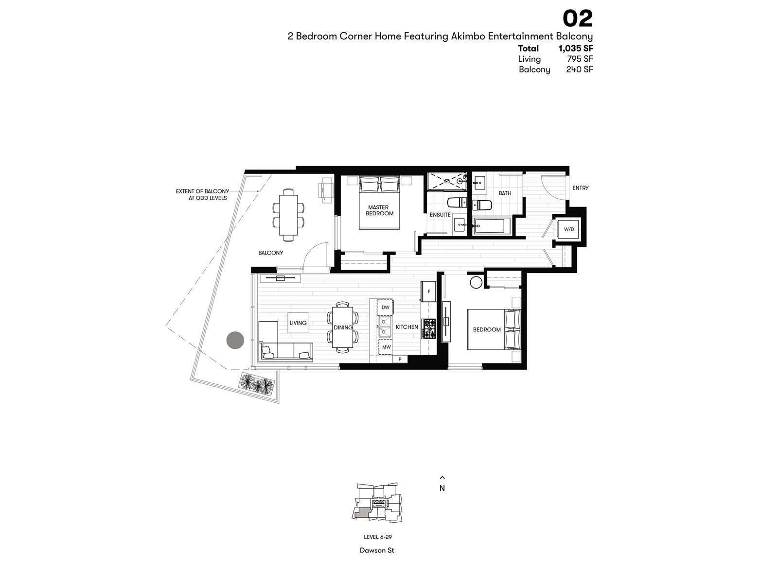 Features in this 7th floor unit include air conditioning, 9ft ceilings, floor to ceiling windows, a modern Kitchen with European inspired cabinetry, quartz countertops and integrated Fisher & Paykel appliances, bedrooms located on separate side of unit to one another, primary Bedroom with ensuite bathroom, a large covered 240 sq ft balcony, spa-like Bathrooms with quartz countertops and recessed lighting, and in-suite washer and dryer