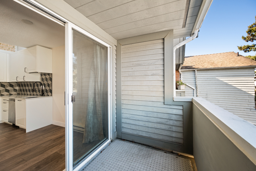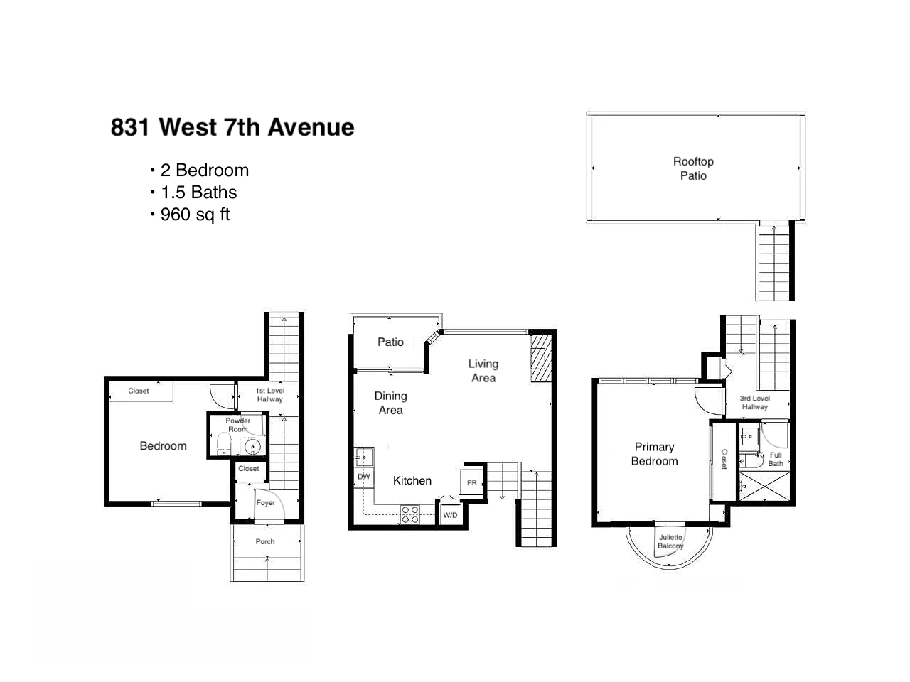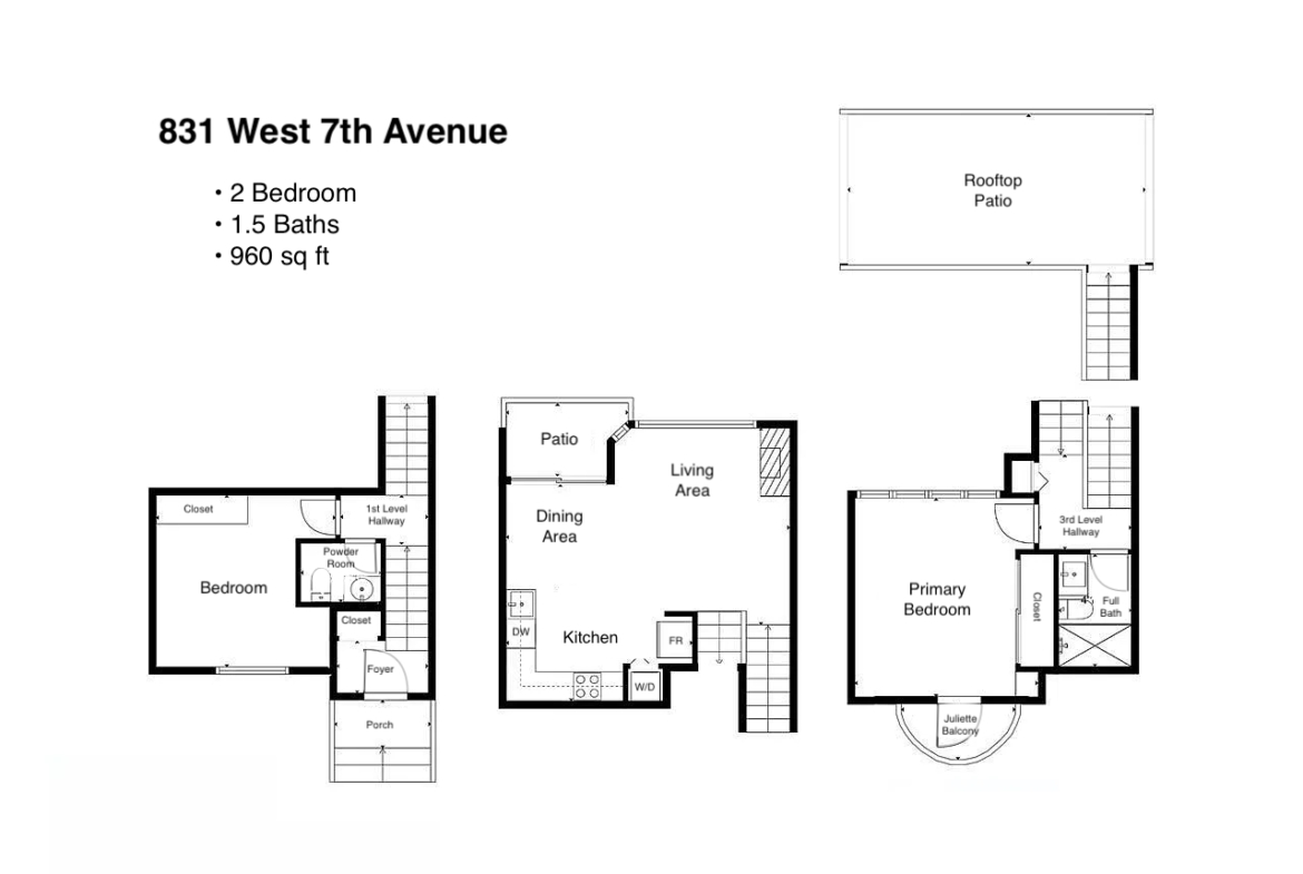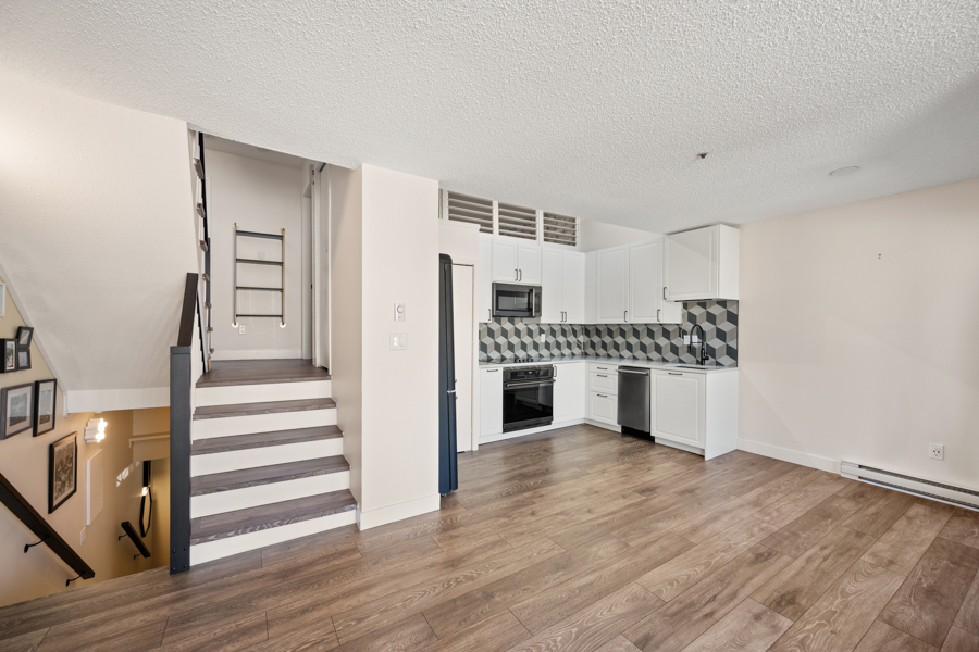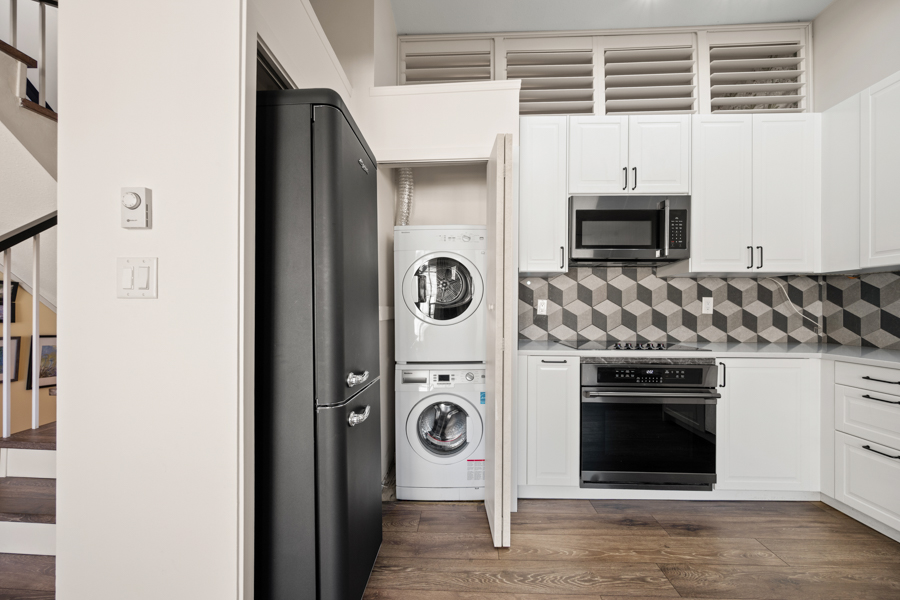 Features in this spacious three-level home include a spacious living area with lofted portion of ceiling and cozy electric fireplace. Open plan kitchen with skylight, kitchen appliances include: fridge, gas glass top, oven, dishwasher, and microwave. Generous sized primary bedroom with Juliette balcony and louvres that open up above the kitchen to let in additional light from the skylight. Full bathroom with step-in shower located on same landing as primary bedroom. A good sized second bedroom with a powder room located on same landing as second bedroom. Three outdoor spaces: a balcony off of dining area (38 sq ft), a Juliette balcony off of primary bedroom (25 sq ft), and a rooftop Patio (204 sq ft) with access via domed roof hatch skylight. In-suite washer and dryer.