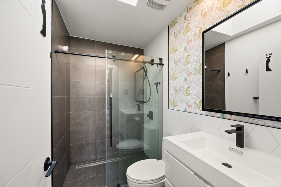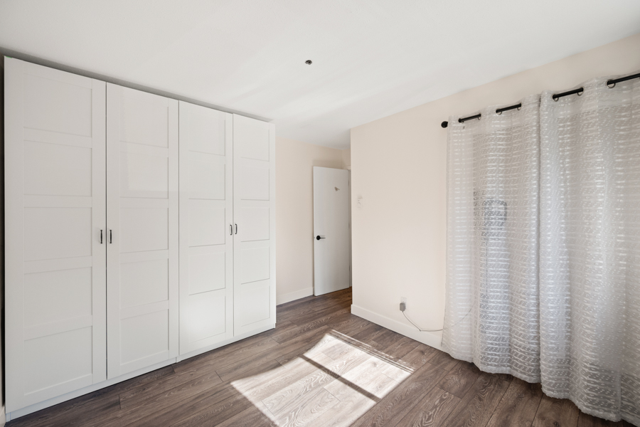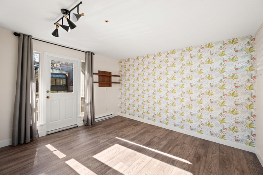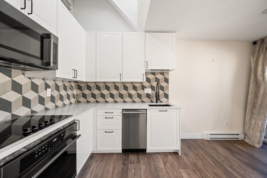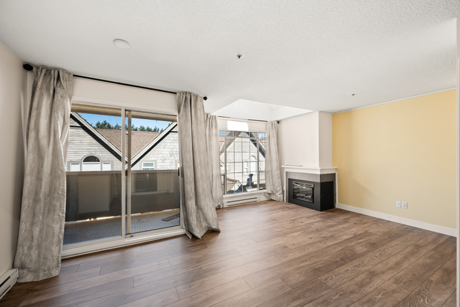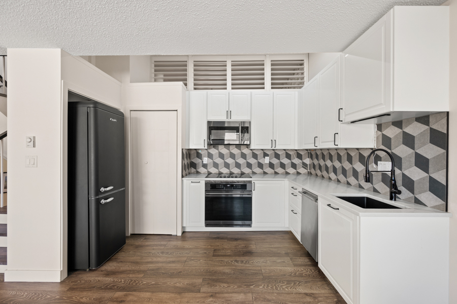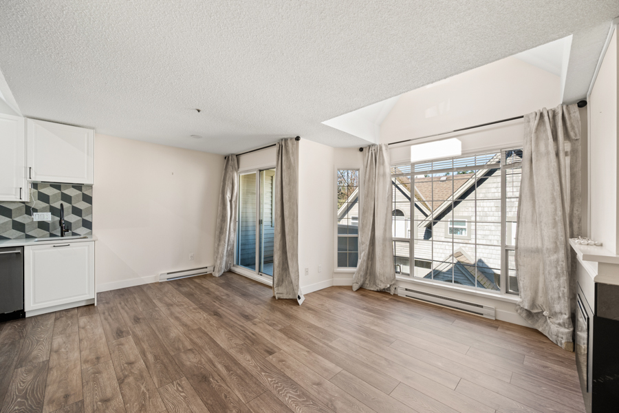 Features in this spacious three-level home include a spacious living area with lofted portion of ceiling and cozy electric fireplace. Open plan kitchen with skylight, kitchen appliances include: fridge, gas glass top, oven, dishwasher, and microwave. Generous sized primary bedroom with Juliette balcony and louvres that open up above the kitchen to let in additional light from the skylight. Full bathroom with step-in shower located on same landing as primary bedroom. A good sized second bedroom with a powder room located on same landing as second bedroom. Three outdoor spaces: a balcony off of dining area (38 sq ft), a Juliette balcony off of primary bedroom (25 sq ft), and a rooftop Patio (204 sq ft) with access via domed roof hatch skylight. In-suite washer and dryer.