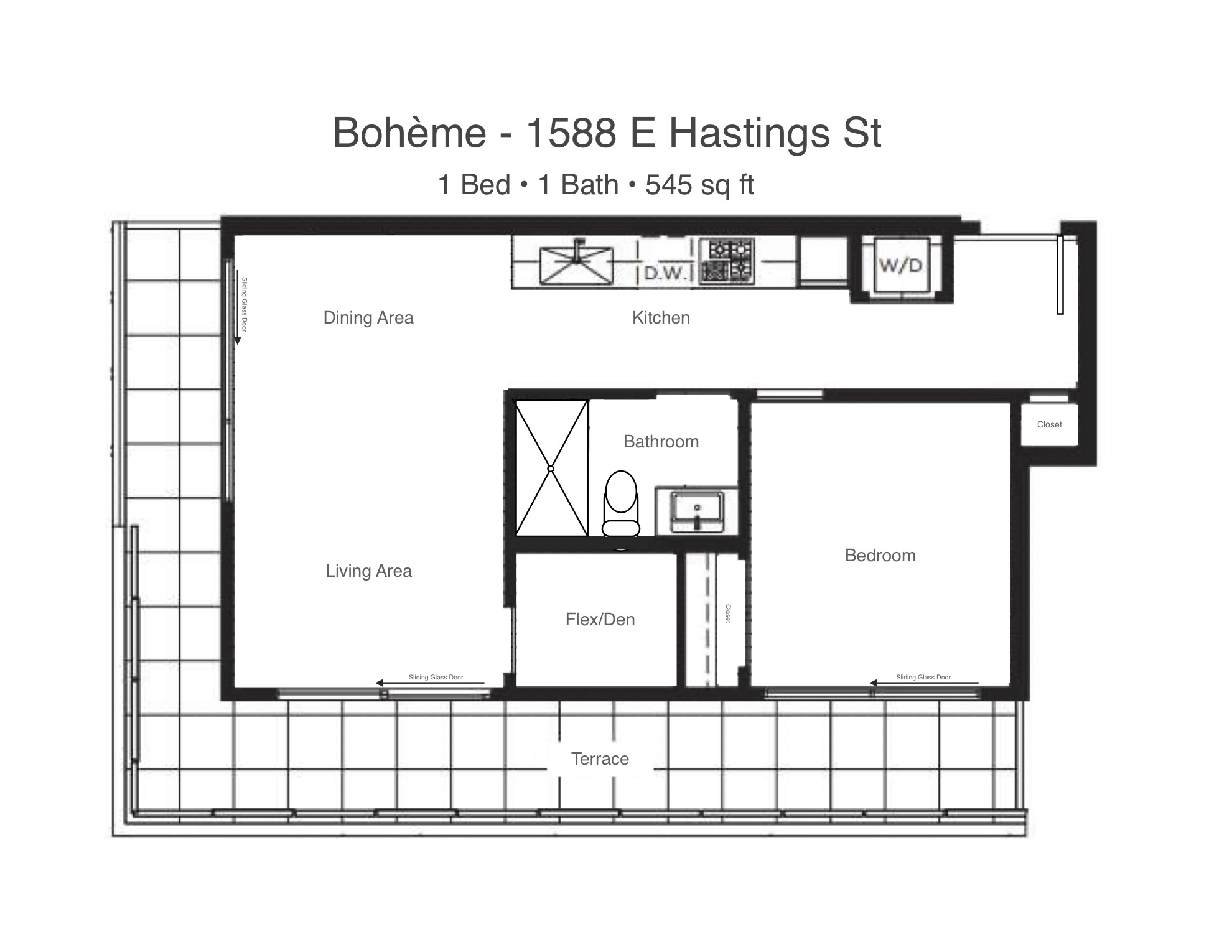 Features Include Spacious bedroom with large closet, den/flex space – perfect for an office or storage, Pullman style kitchen with plenty of storage, Quartz countertop in kitchen and bathroom, Stainless steel and integrated appliances, Extra large wrap around balcony – 200 square feet, and In-suite washer and dryer.