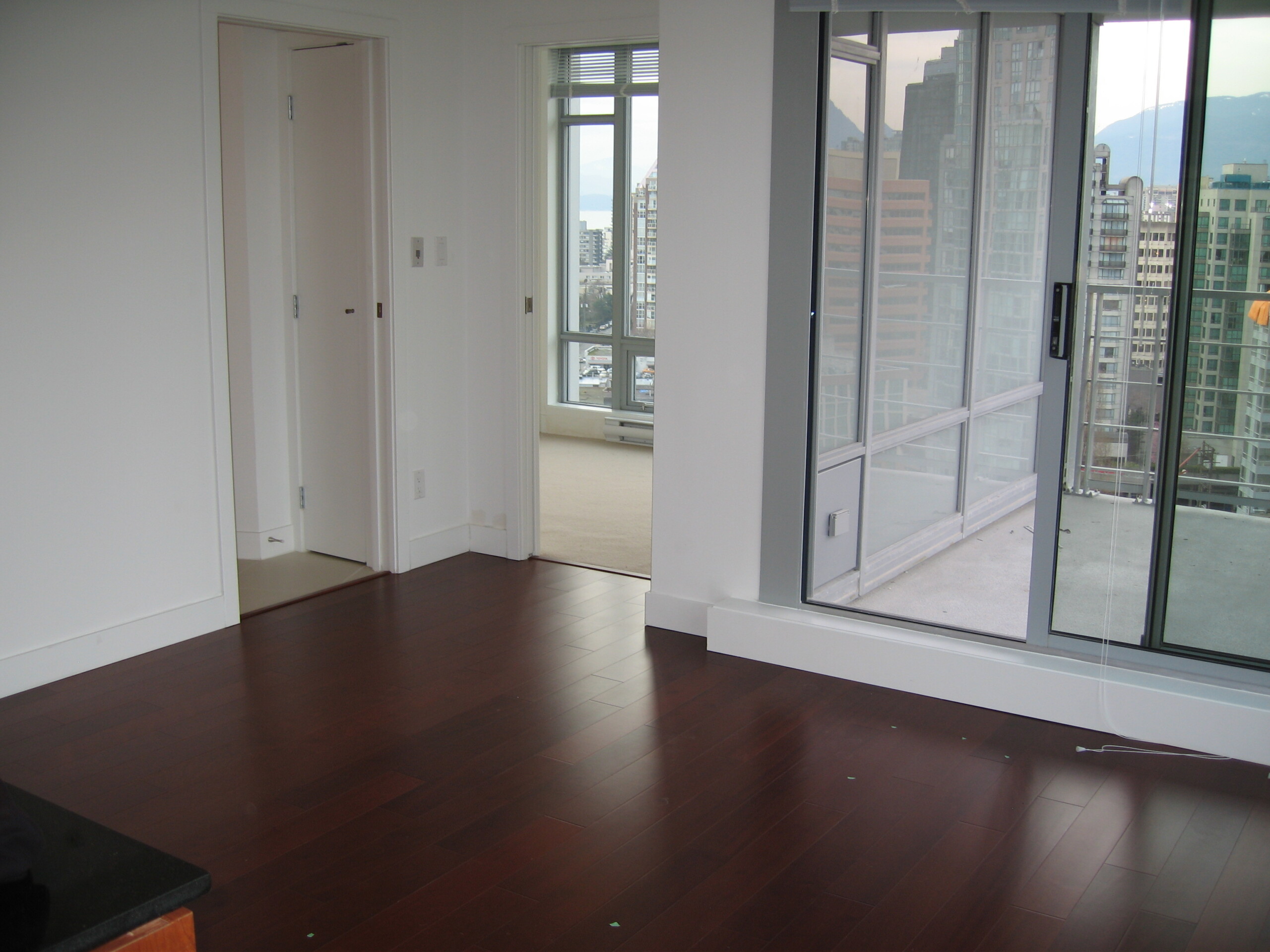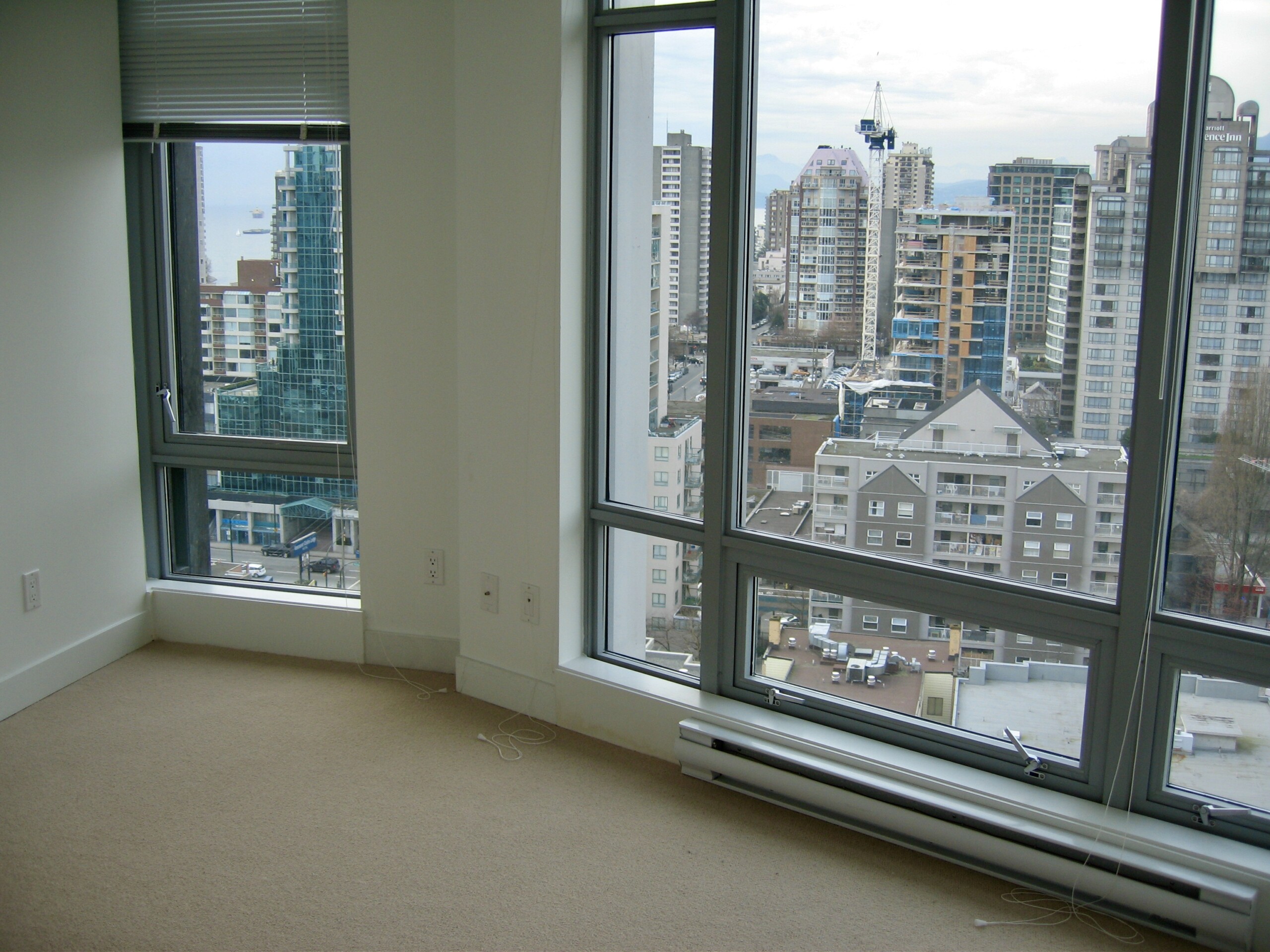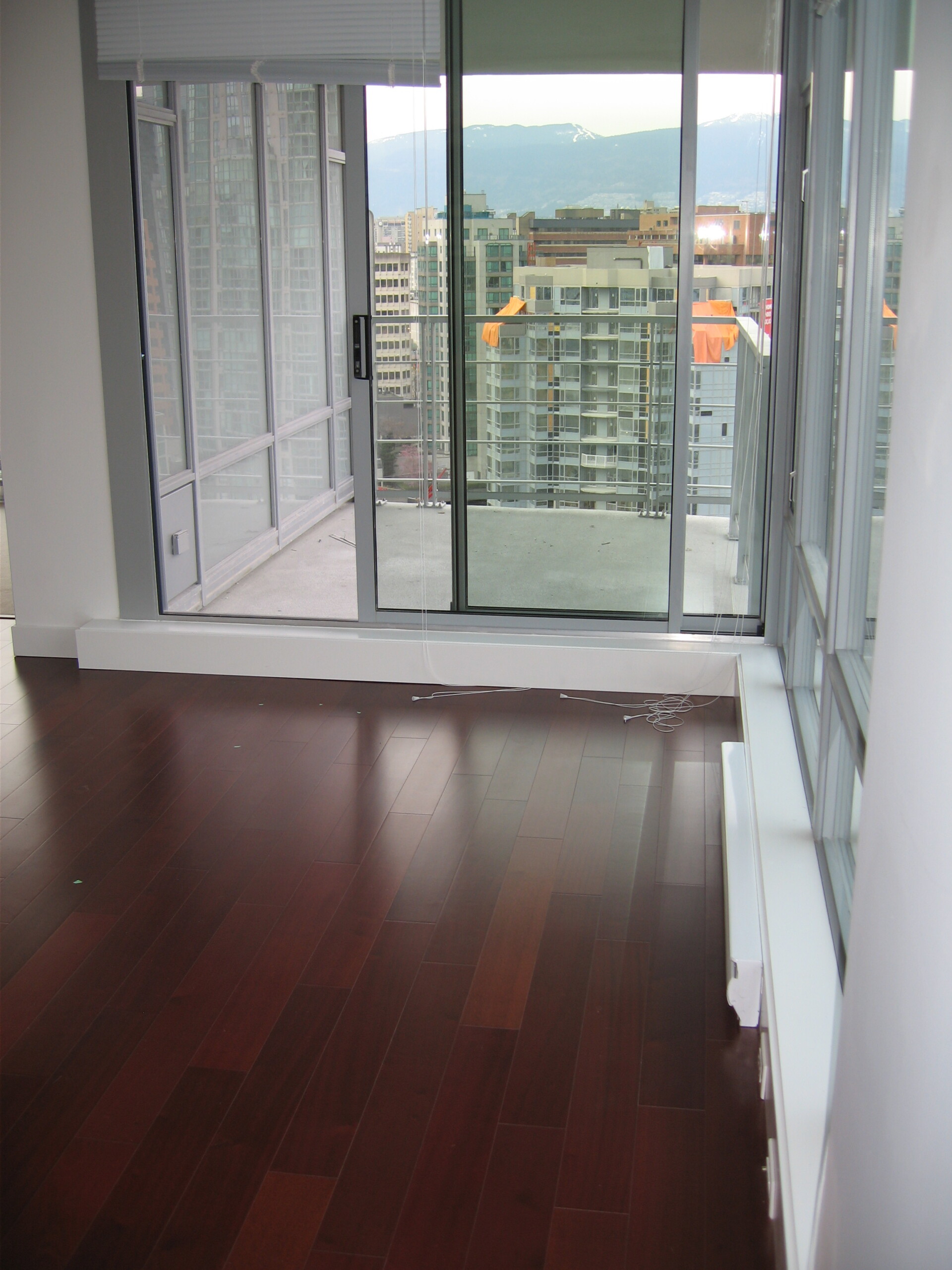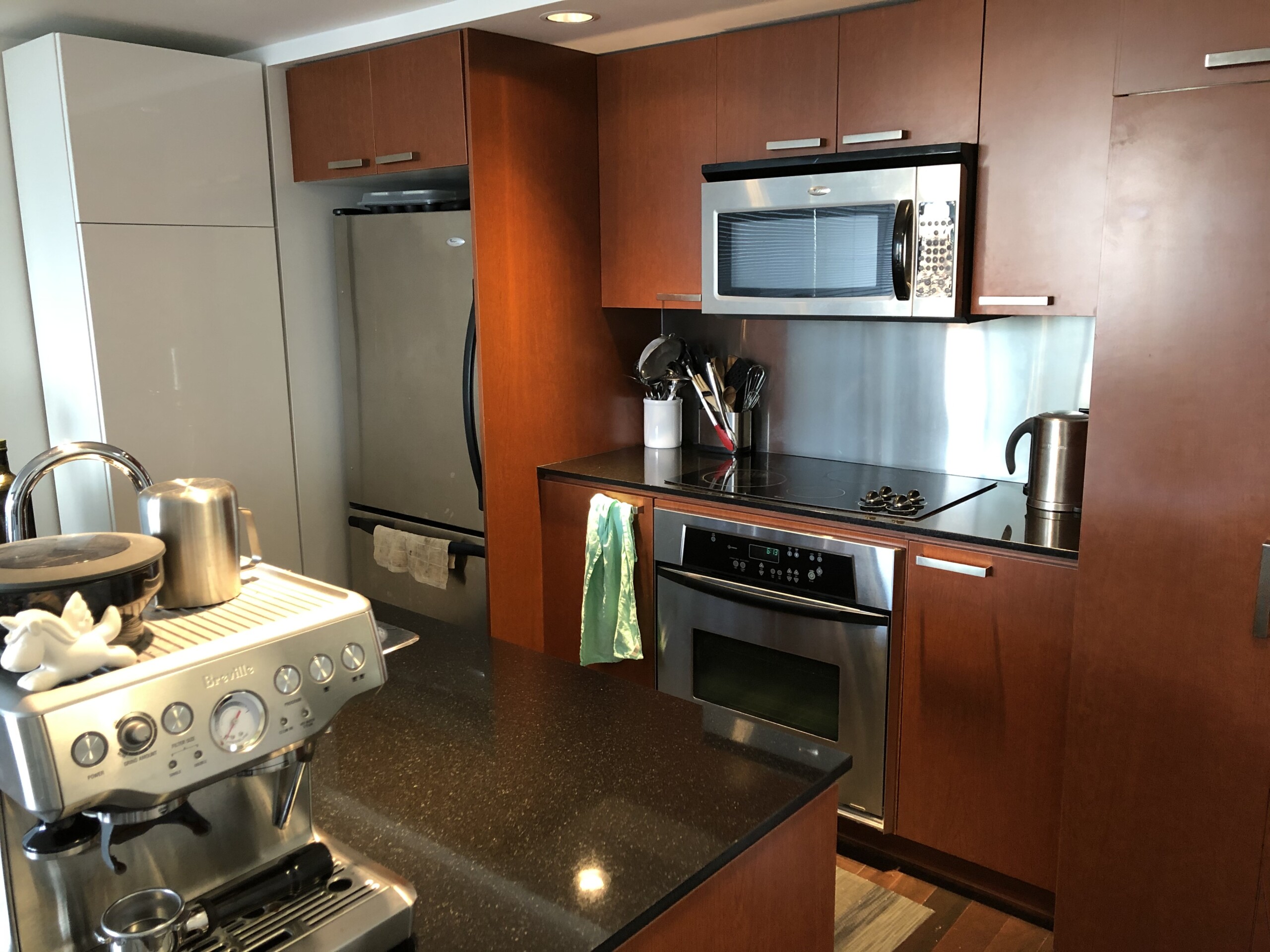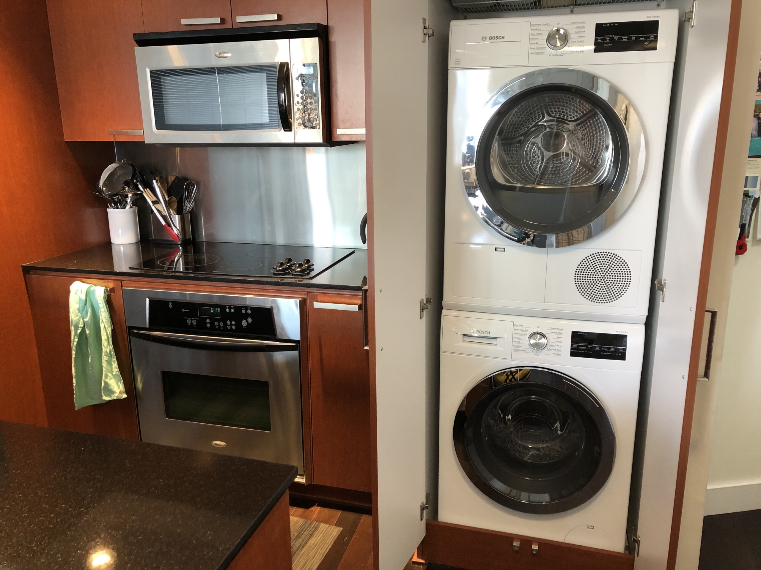 Features in this unit include Corner unit open plan living, floor to ceiling windows to allow plenty of natural light, den for a home office or extra storage room, full-size stainless steel appliances: Fridge, Dishwasher, Stove, Oven, Microwave, laminate wood flooring throughout living, dining and kitchen, covered private patio (80 sq. ft), North West views of the city and mountains, and in-suite washer and dryer.