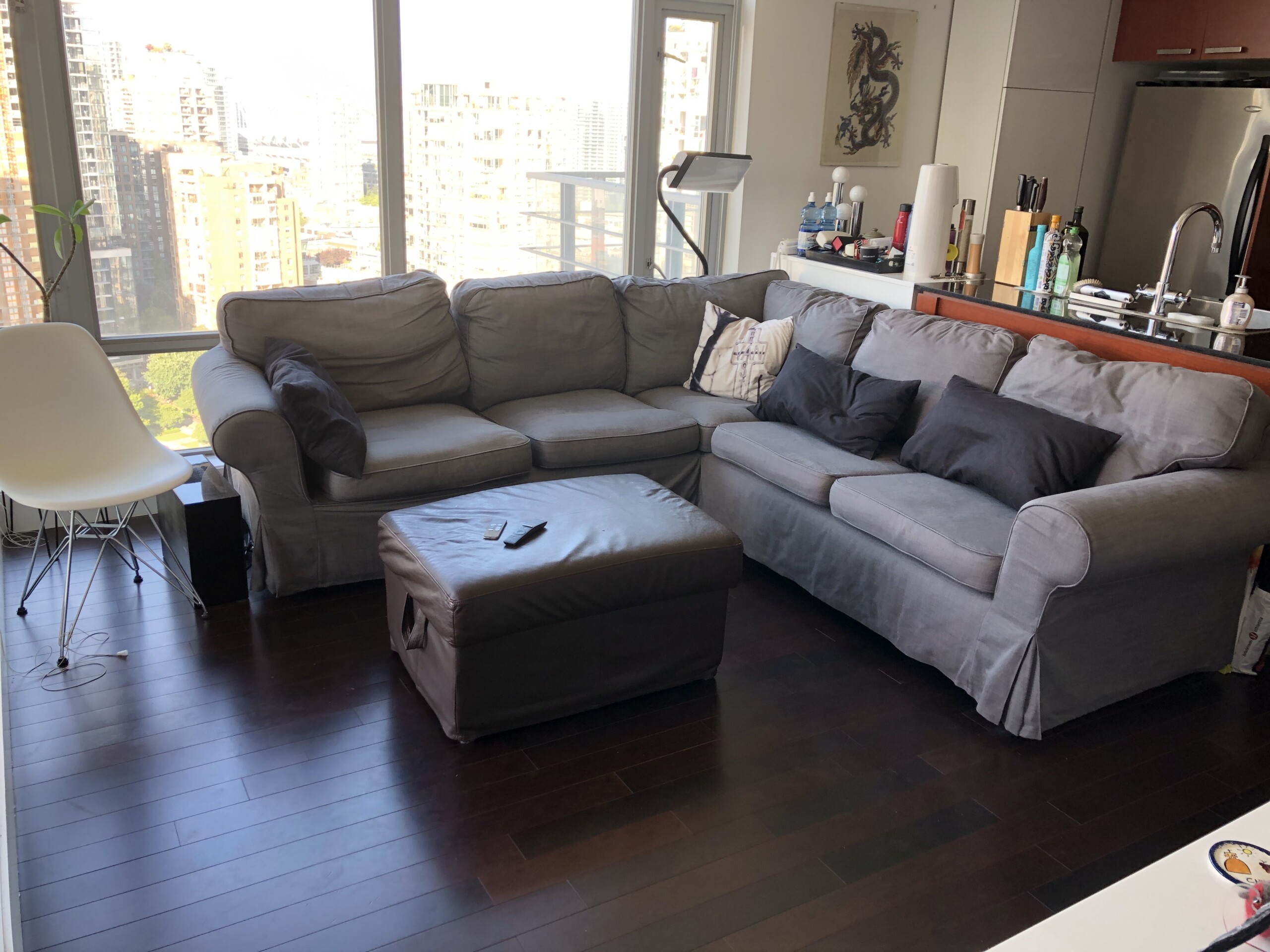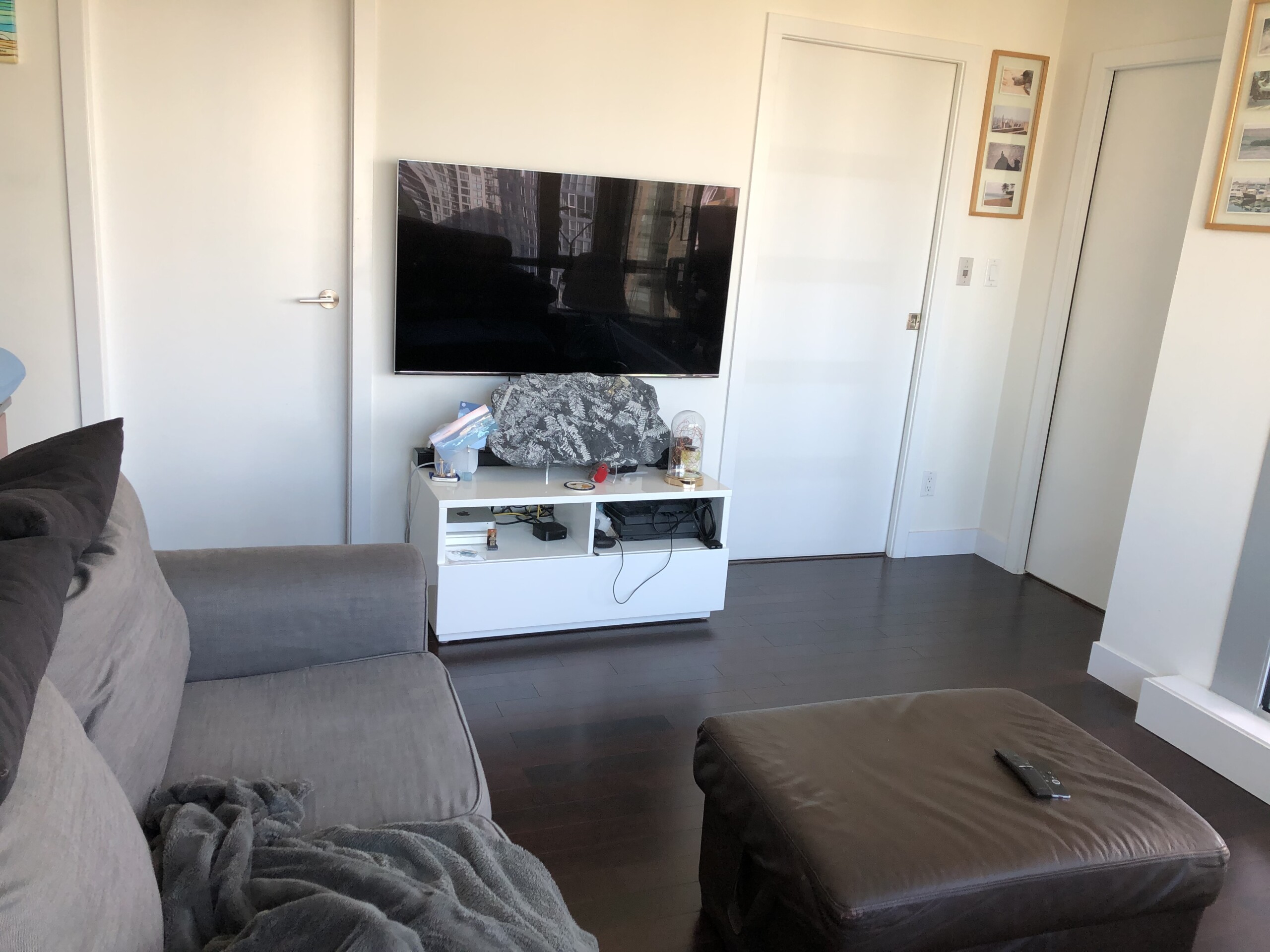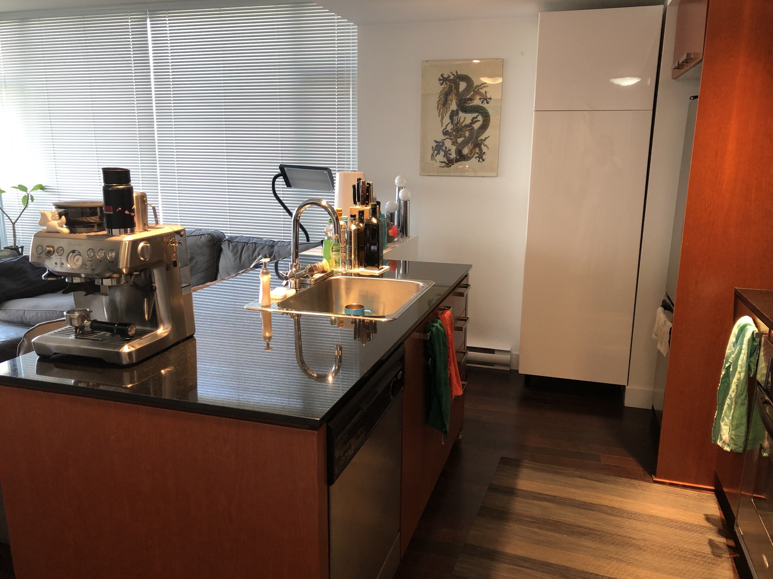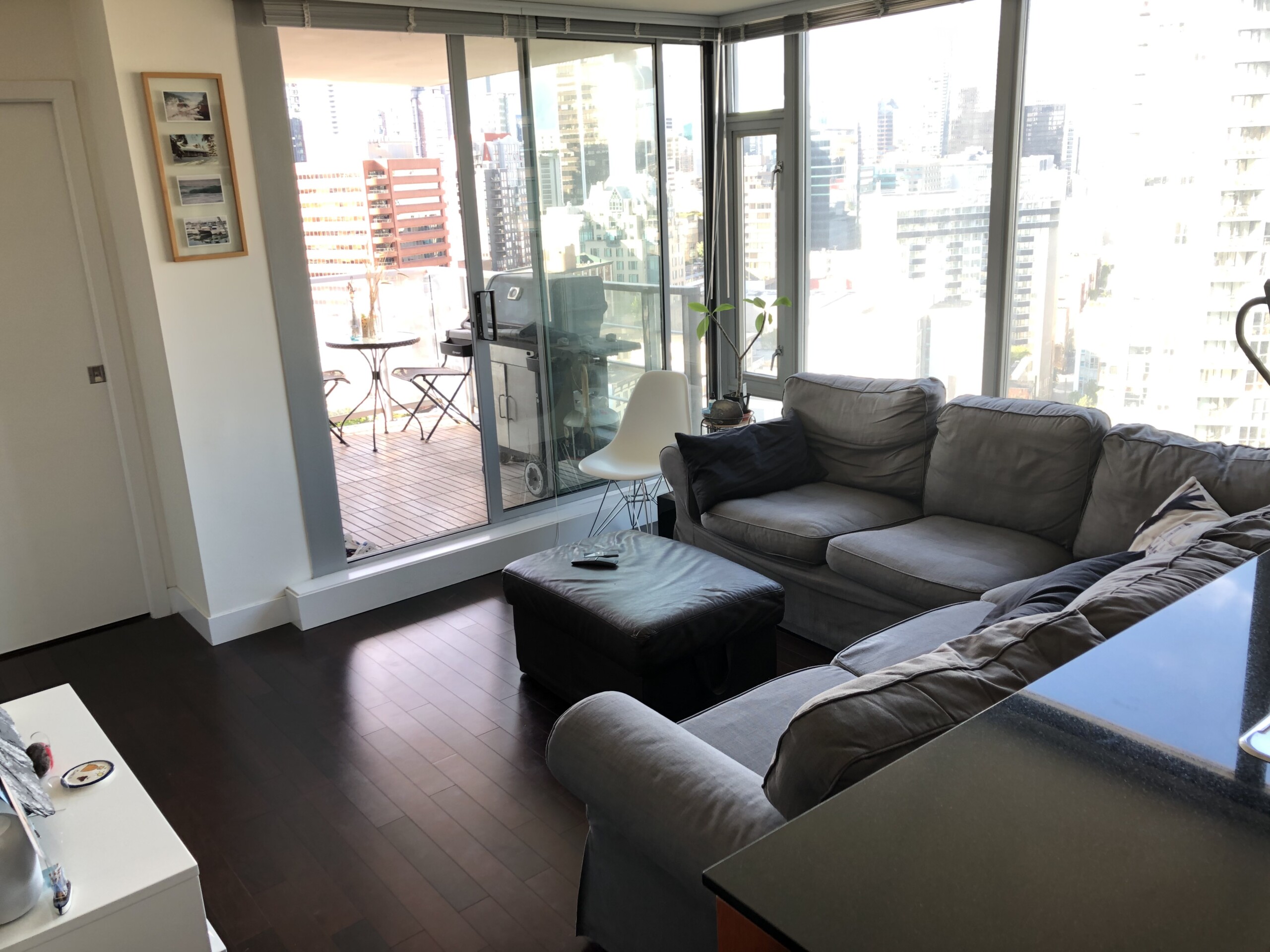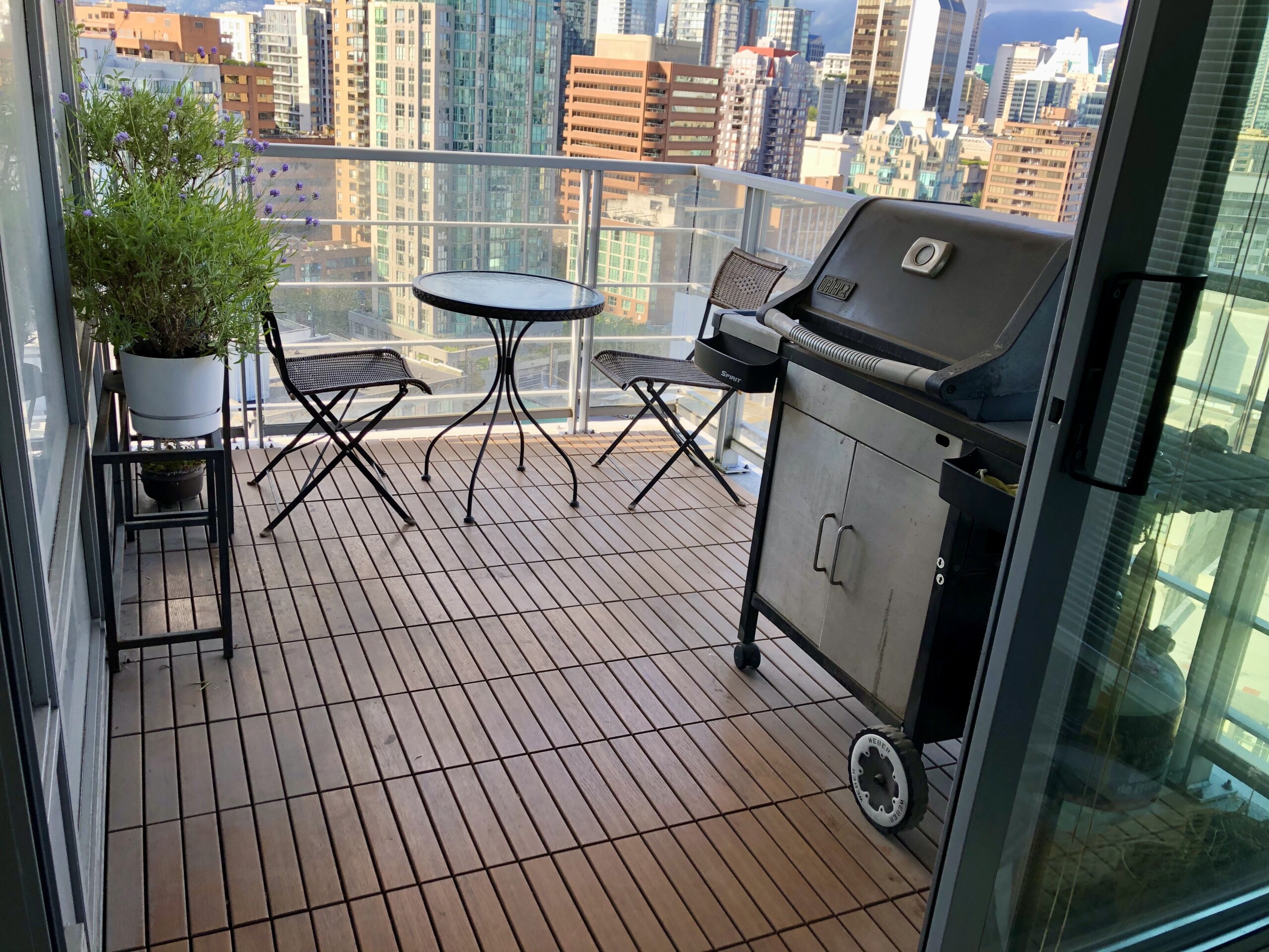 Features in this unit include Corner unit open plan living, floor to ceiling windows to allow plenty of natural light, den for a home office or extra storage room, full-size stainless steel appliances: Fridge, Dishwasher, Stove, Oven, Microwave, laminate wood flooring throughout living, dining and kitchen, covered private patio (80 sq. ft), North West views of the city and mountains, and in-suite washer and dryer.