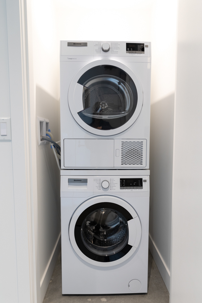 Features in this 3rd floor unit include a “Cressy Kitchen” with lots of built in storage and swing-out pantry, integrated and stainless steel appliances including: fridge, glass cooktop, dishwasher, wall oven, and built in microwave, a functional kitchen island with more storage and room for seating, flex space off of kitchen area, living area with built-in desk/entertainment nook, sliding frosted glass wall to bedroom area, opens wide for a more spacious feel, built in wardrobe in the bedroom, this unit has an oversized patio that looks out over green roof. The parking stall for this unit is EV ready if needed, but has not been installed. In-suite washer and dryer