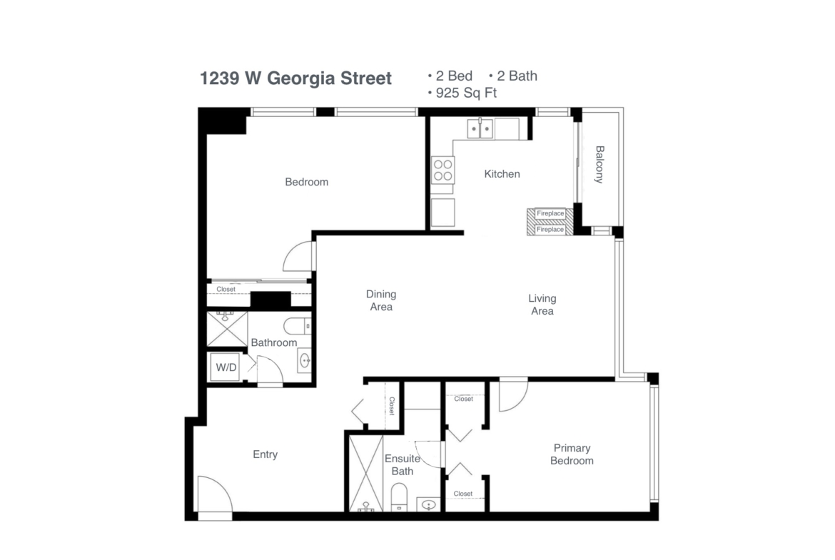 Features in this property include over height ceilings, floor to ceiling windows, gas fireplace with stylish brick details, full-size appliances: fridge, stove & oven, dishwasher, modern kitchen with quartz counter tops, hardwood and glossy white tiled flooring throughout, spacious bedrooms on separate side of unit, primary Bedroom with ensuite spa-like bathroom, vanity and walk-in closet, covered balcony, and in-suite washer and dryer