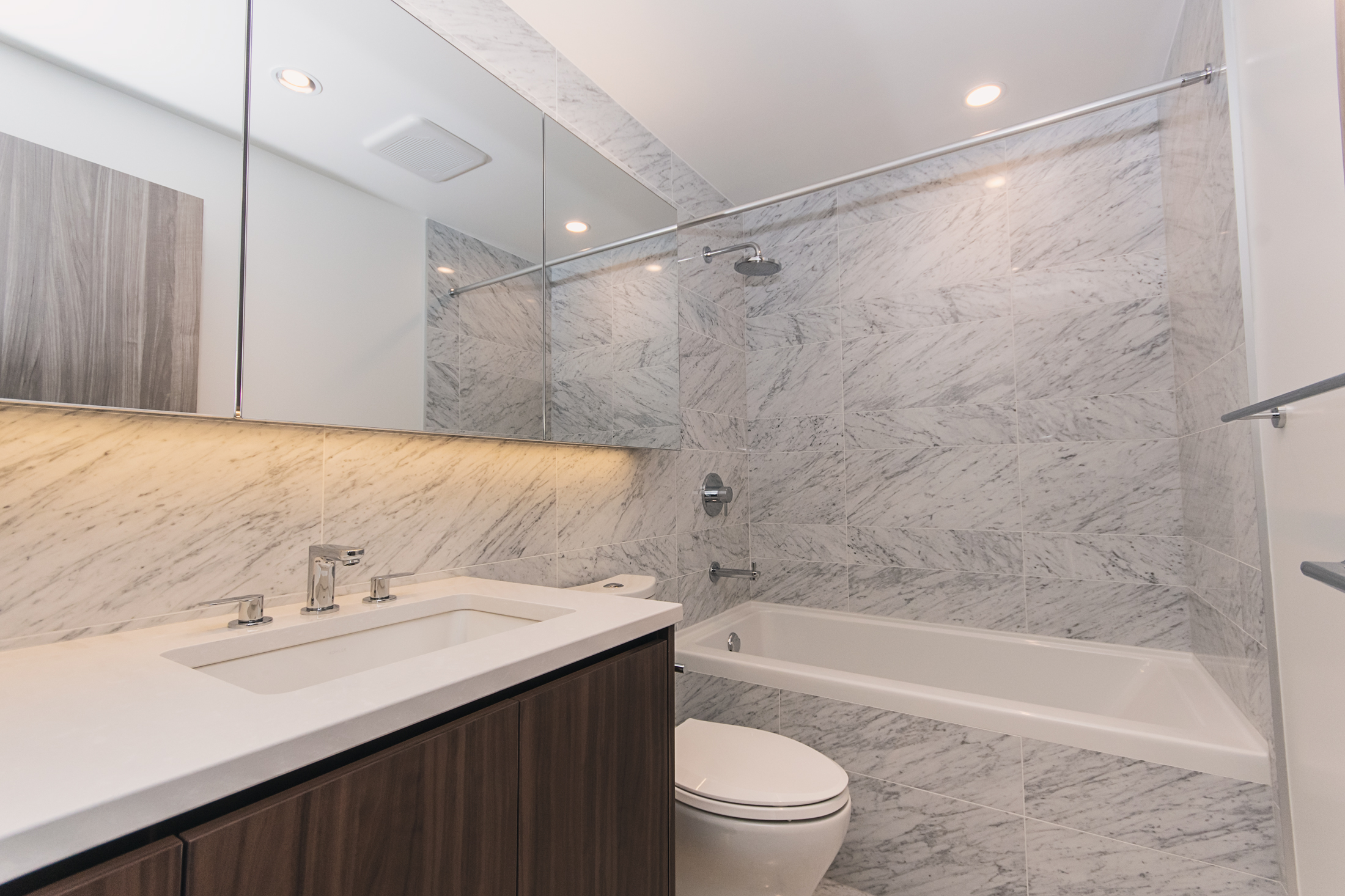 Features in this brand new South-West facing condo include in-unit central heating & air conditioner, electric blinds in the living room, a 330 sq ft wraparound balcony, dark roller shade window coverings, modern kitchen with quartz counter tops, full-sized stainless steel & integrated appliances, smart home thermostat, in-suite washer and dryer, and a living room with floor to ceiling windows on 2 walls and stacker doors that transition onto a large covered balcony