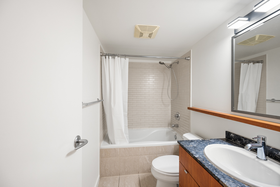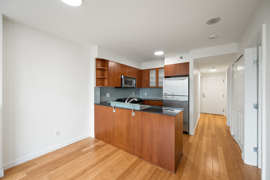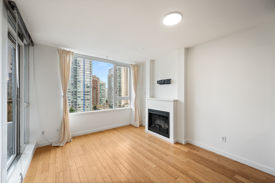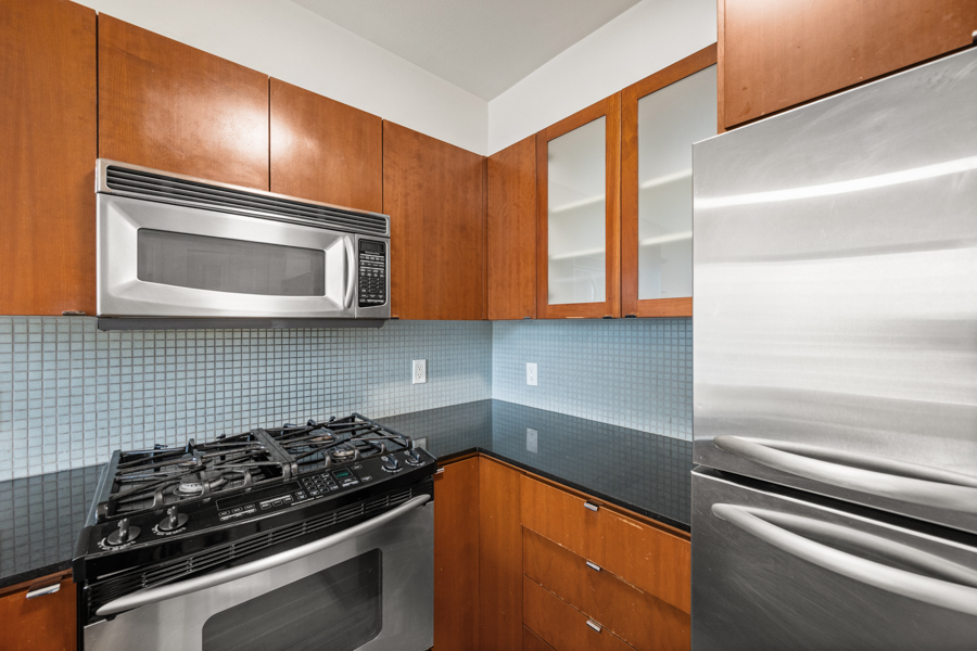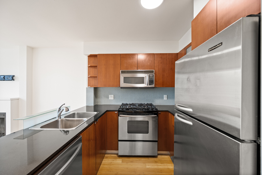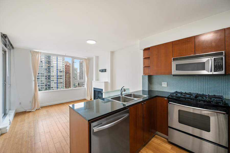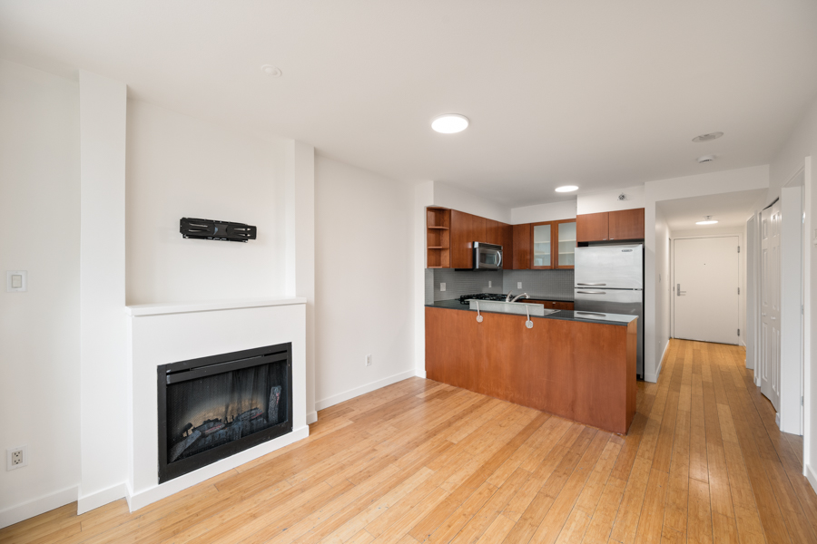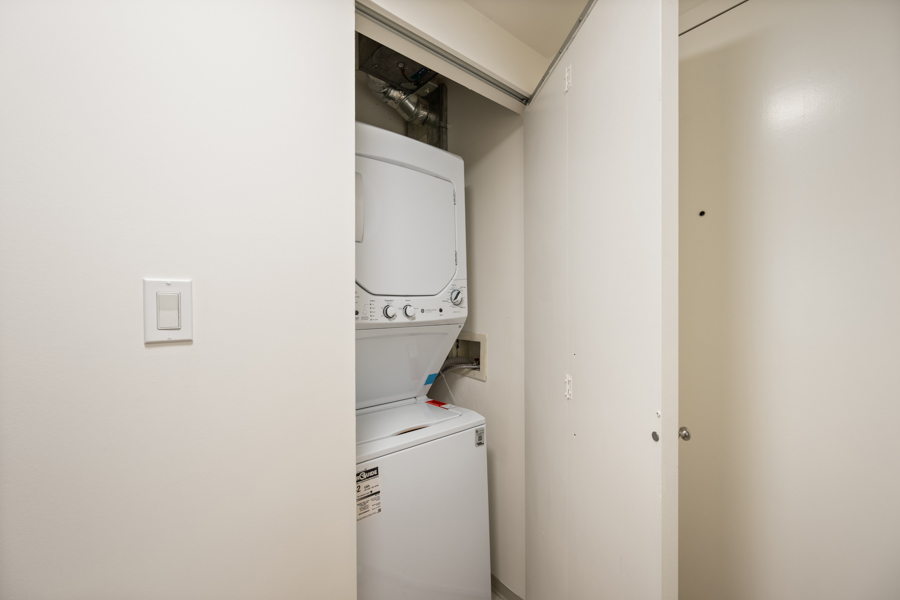 Features in this 11th floor unit include an open plan kitchen with quartz kitchen peninsula island & countertops, with tile backsplash. Stainless steel appliances: fridge, stove, new dishwasher, and microwave. Flex space. Laminate flooring throughout living areas, tiled flooring in bathroom. Electric fireplace, Private patio with stunning city views. Brand new In-suite washer and dryer.