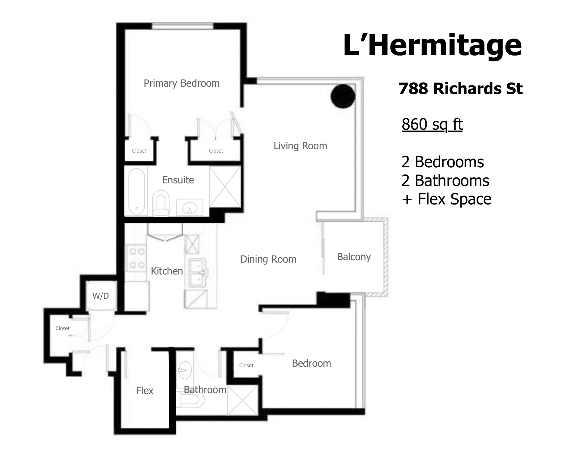 L’Hermitage is located in downtown Vancouver, just steps away from Vancouver Public Library, Queen Elizabeth Theatre, Vancouver Art Gallery and all the modern conveniences and amenities of downtown living. Just a 4 minute walk to Vancouver City Centre Station and a 6 minute walk to Granville Station.