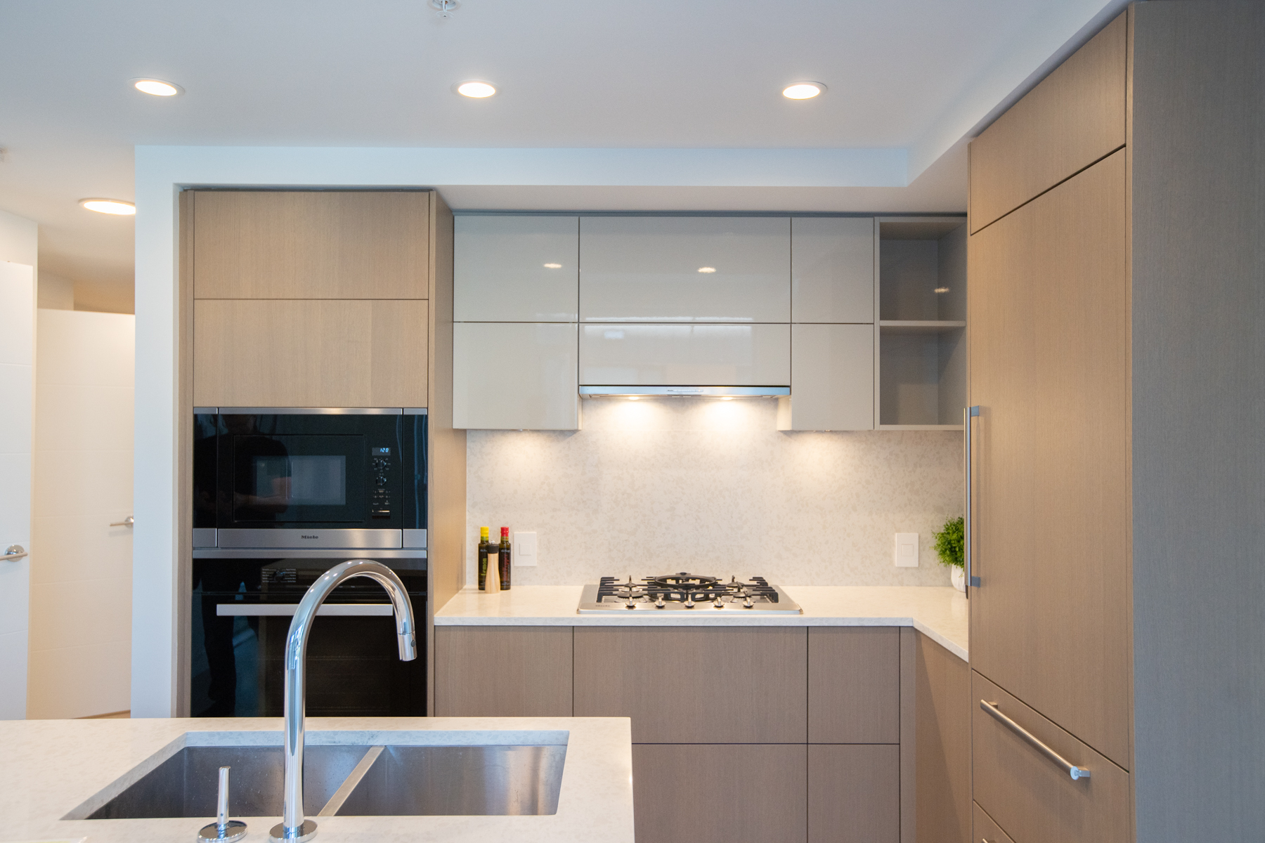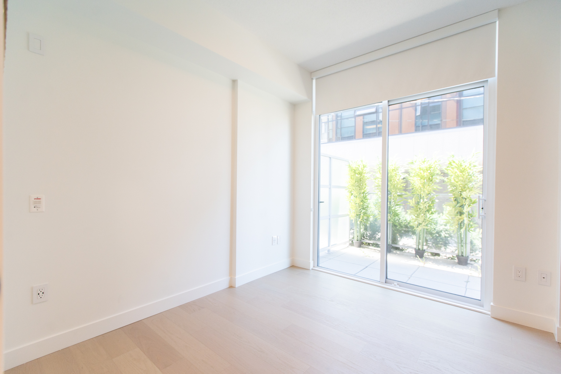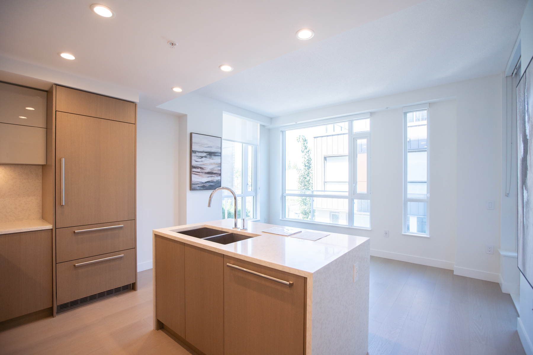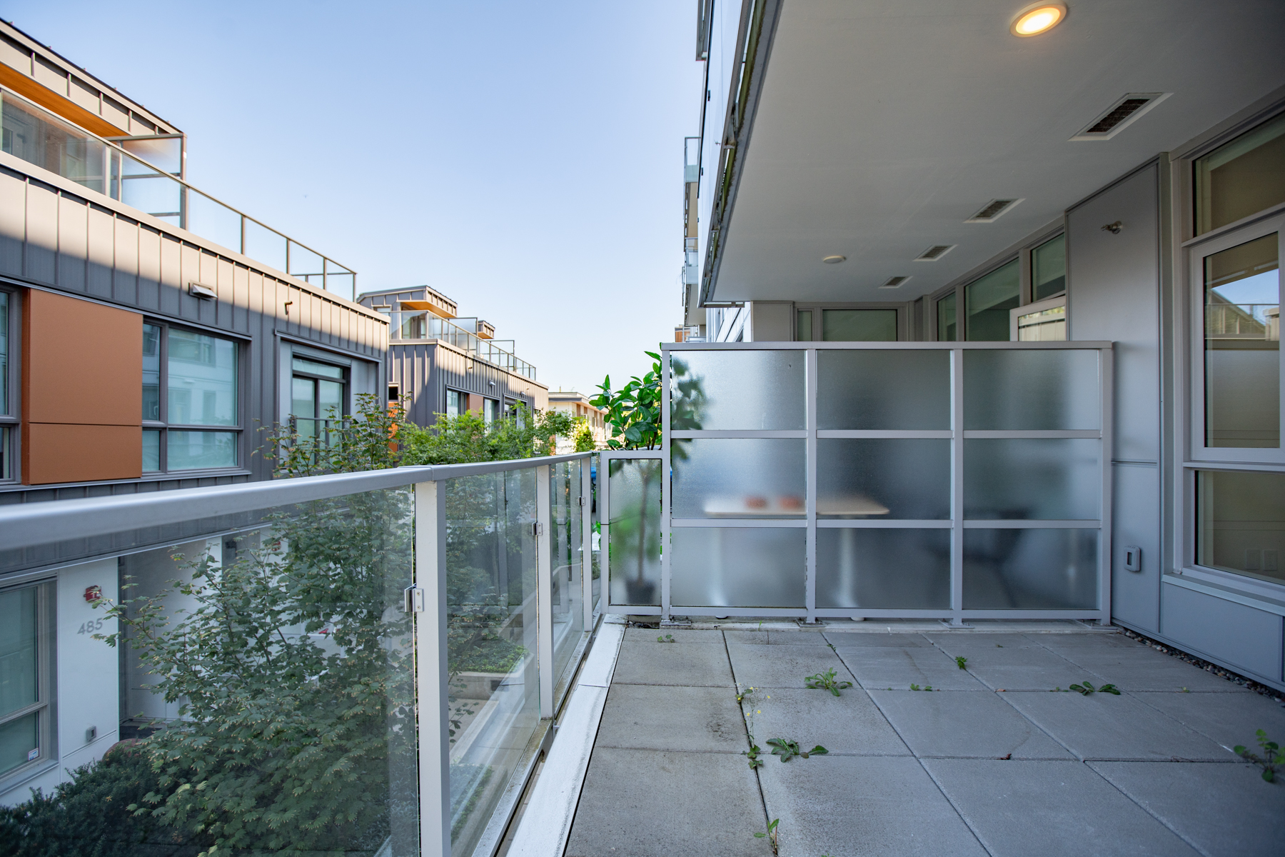 Features in this second floor corner unit include a 412 sq ft wraparound patio, open plan kitchen with Italian style cabinetry with kitchen island and quartz countertops & backsplash. Stainless steel and integrated Miele appliances: fridge, gas cook top, oven, dishwasher, and microwave, central air-conditioning & heating, 9’3” ceilings, spacious primary bedroom with built in cabinetry system, in-suite storage room/flex space, wide plank engineered hardwood flooring throughout, and in-suite washer and dryer