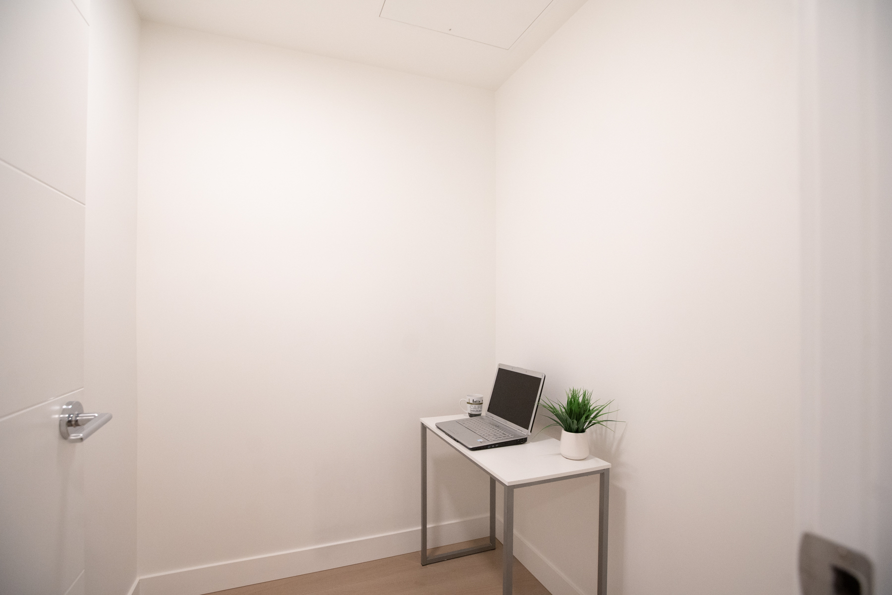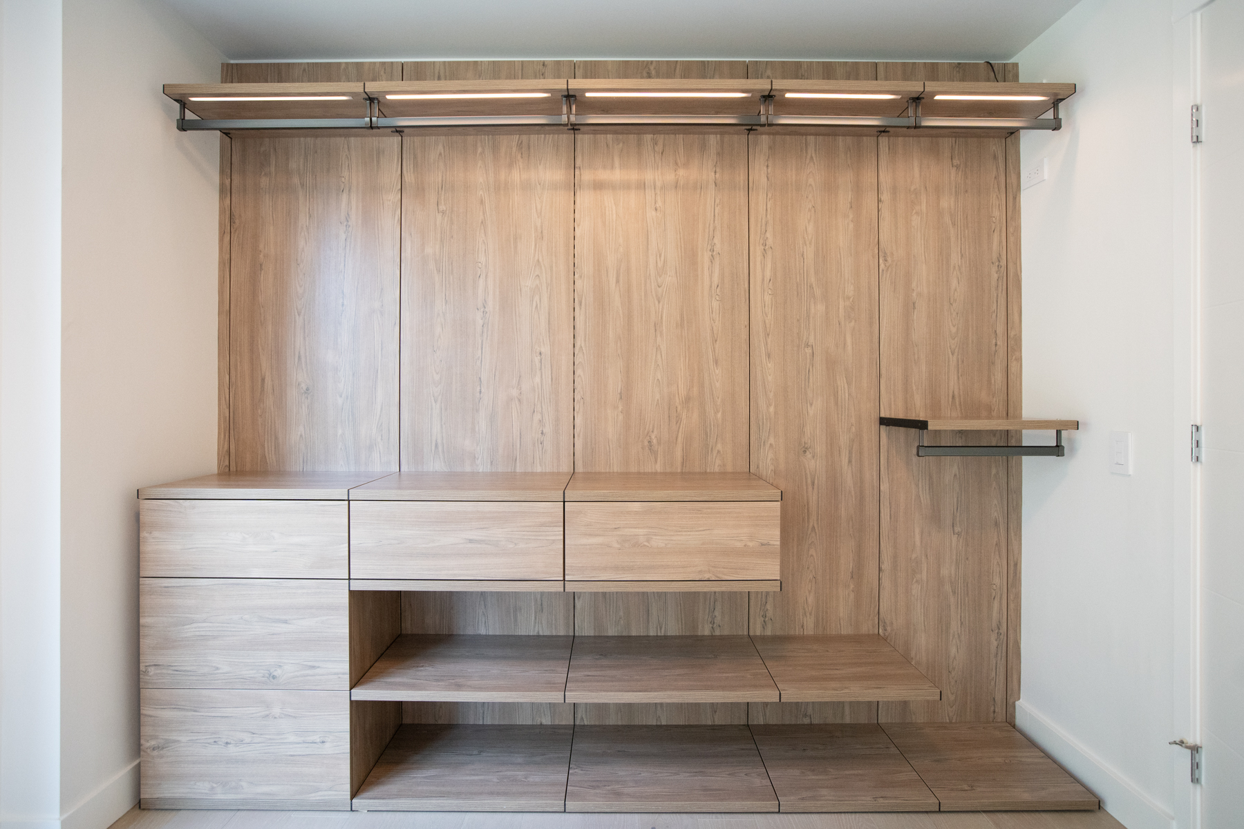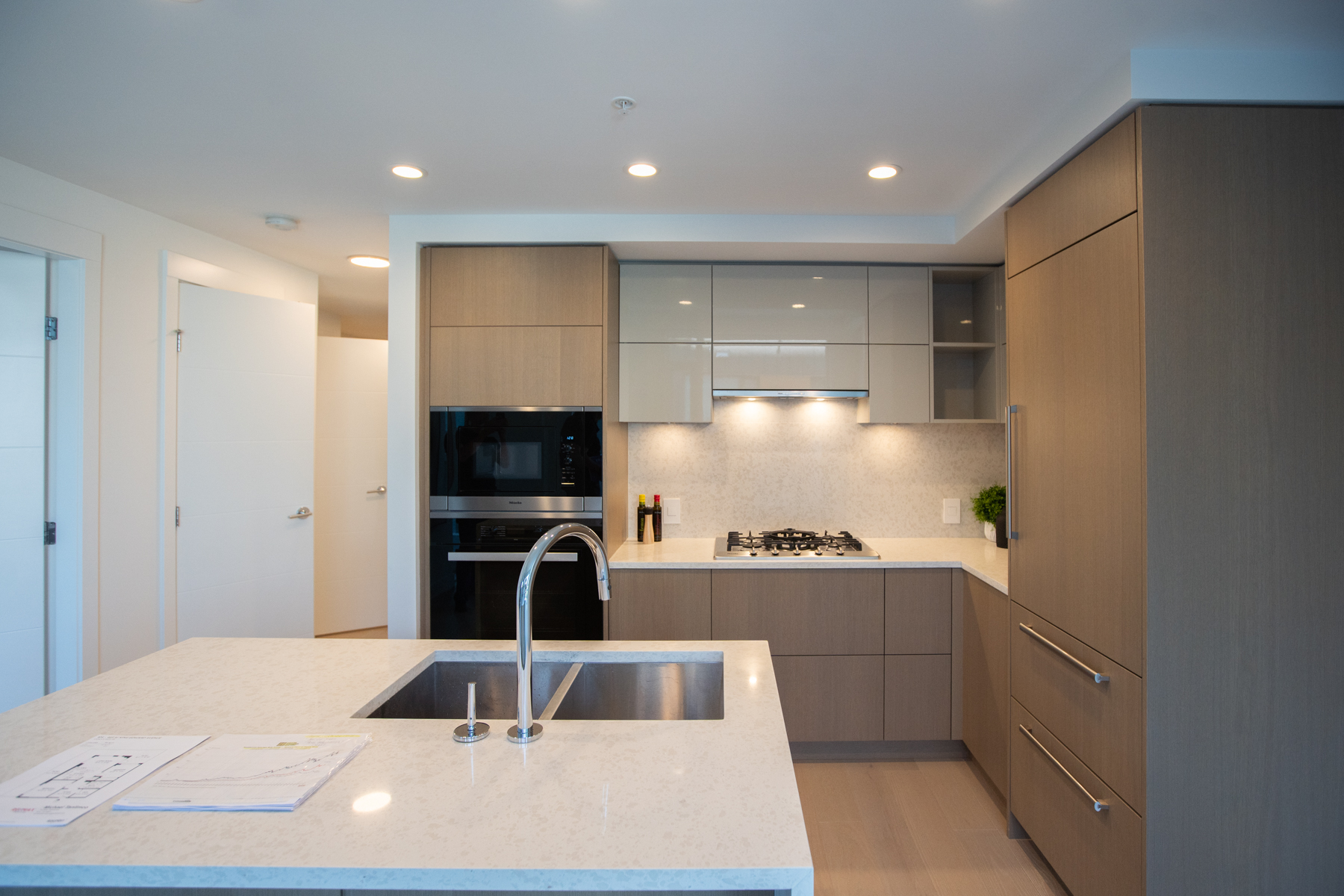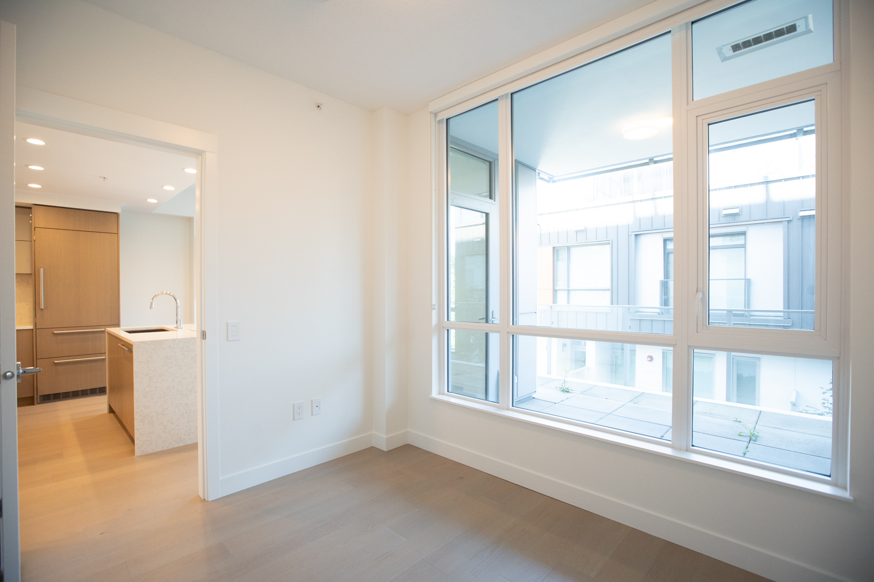 Features in this second floor corner unit include a 412 sq ft wraparound patio, open plan kitchen with Italian style cabinetry with kitchen island and quartz countertops & backsplash. Stainless steel and integrated Miele appliances: fridge, gas cook top, oven, dishwasher, and microwave, central air-conditioning & heating, 9’3” ceilings, spacious primary bedroom with built in cabinetry system, in-suite storage room/flex space, wide plank engineered hardwood flooring throughout, and in-suite washer and dryer
