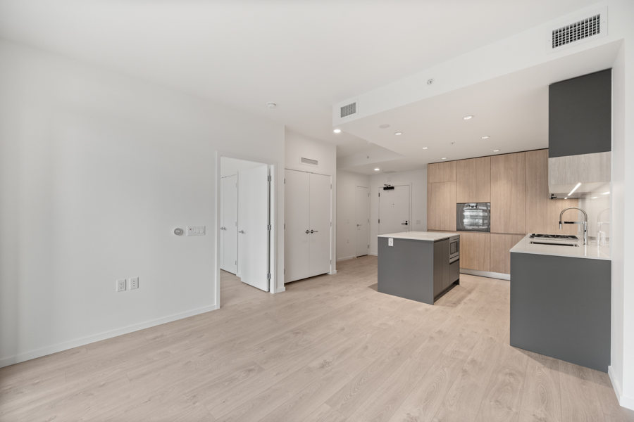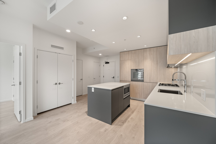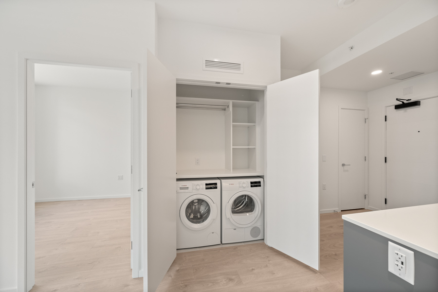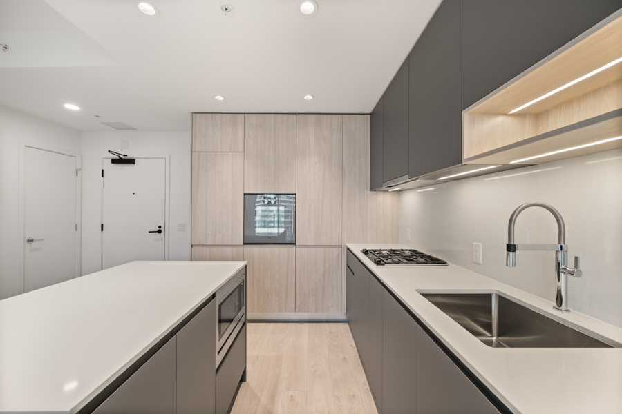Features in this well appointed one bedroom unit include high-end stainless steel and integrated Gaggenau and Bosch appliances: fridge, gas cook top, oven, dishwasher, and microwave. Quartz kitchen island, countertops & backsplash, central air-conditioning & heating, a private covered balcony, and in-suite washer and dryer