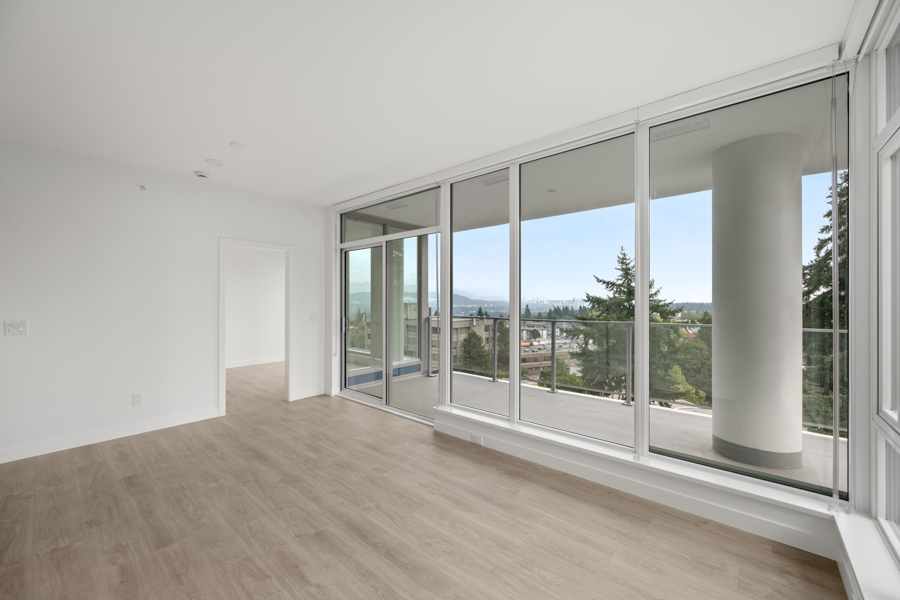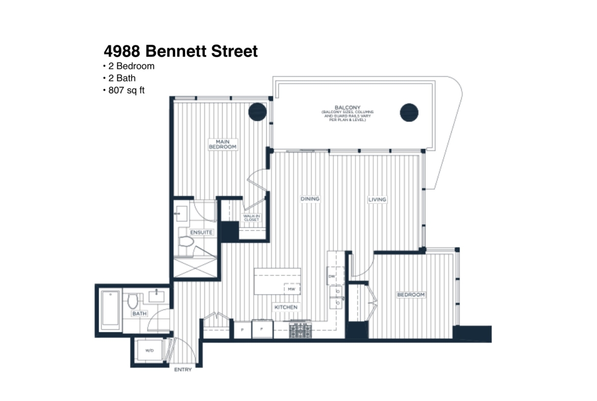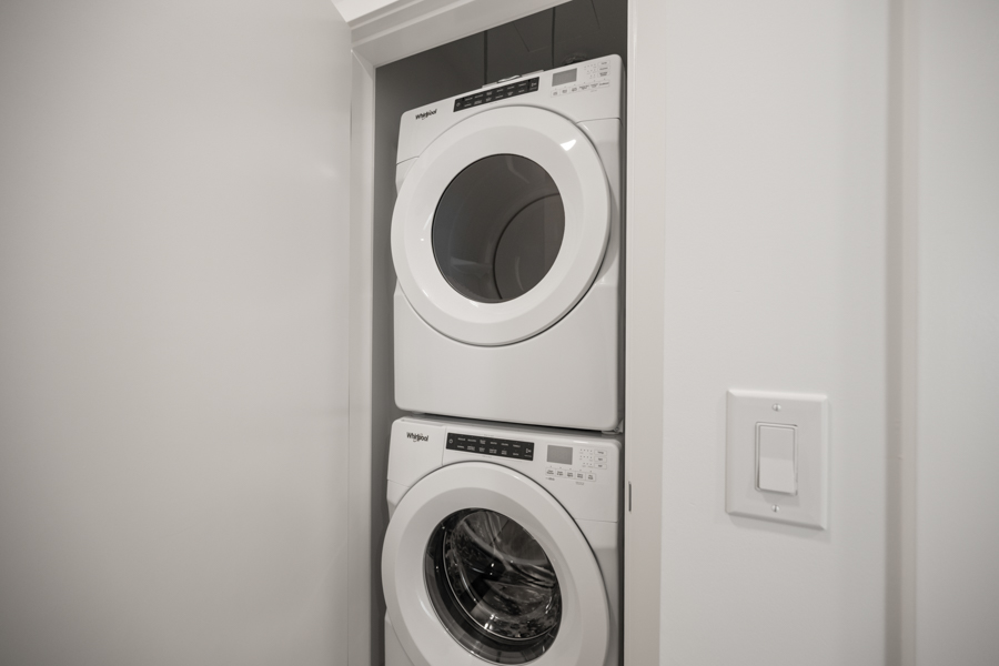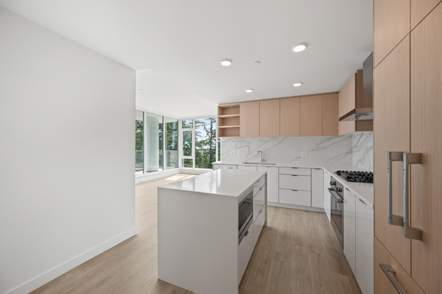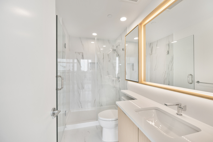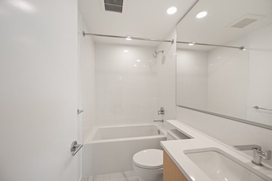 Features in this 10th floor unit include Laminate flooring throughout, Air-conditioning, and Floor to ceiling windows. Modern open-plan kitchen with under-cabinet task lighting, quartz composite countertops, and breakfast bar seating with Full-sized stainless steel and integrated appliances by Bosch & Fisher & Paykel: fridge, gas cook top, oven, dishwasher, and microwave. Primary bedroom with walk-in closet and ensuite bathroom. Spa inspired bathrooms, ensuite has glass step-in shower and main bath has large soaker tub and full-wall vanity mirror with LED trim lighting. Private ~134 sq ft Covered Balcony. In-suite washer and dryer