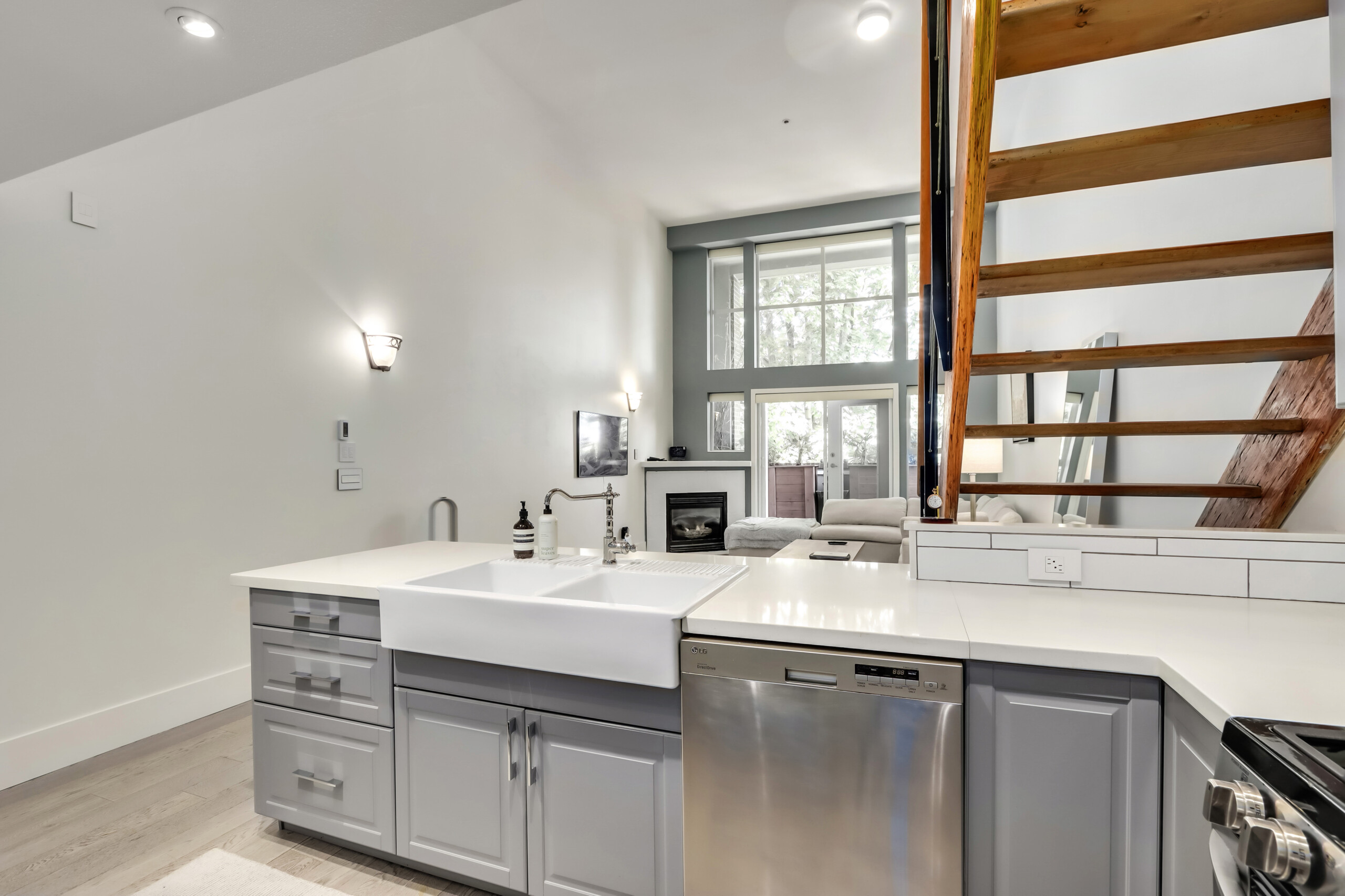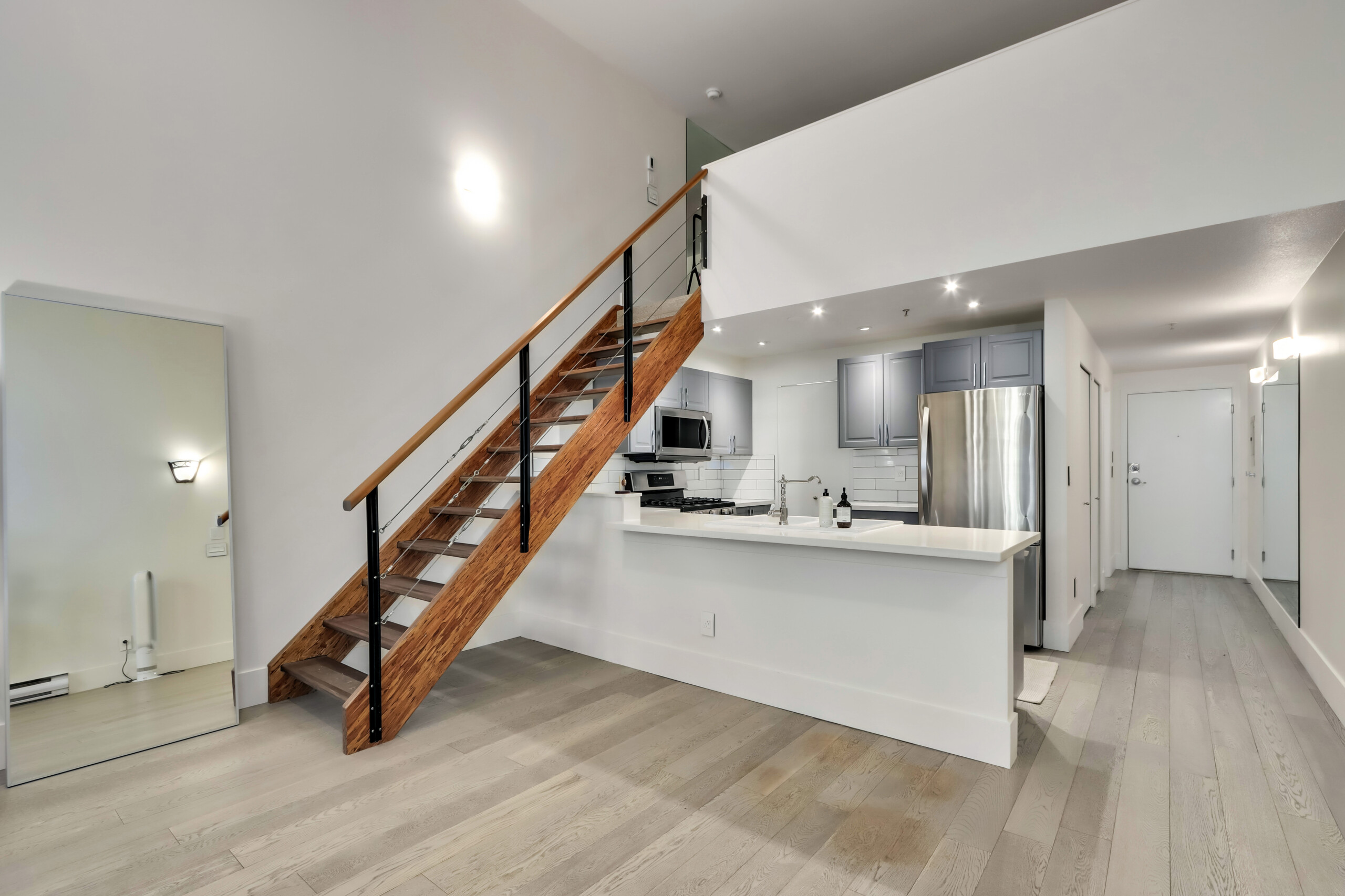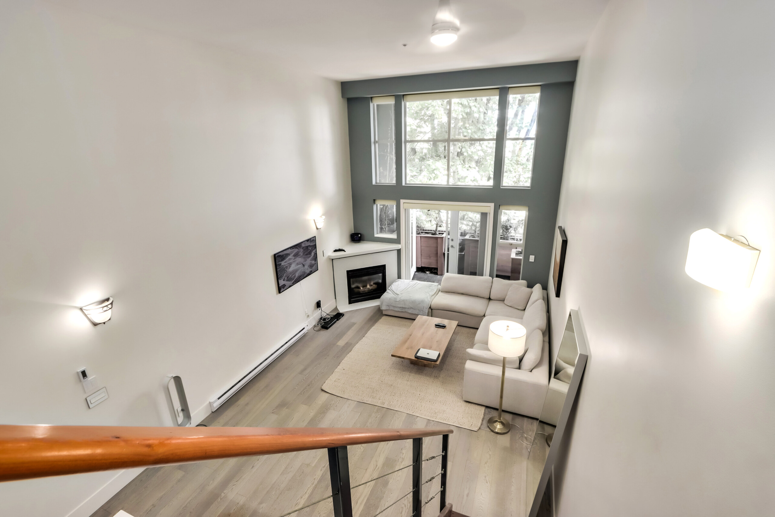 Features in this unique loft space include soaring 16’ ceilings, large living space, cozy gas fireplace, king-sized loft bedroom with 2 closets and powder room, modern open plan kitchen with ample storage space and new countertops, stainless steel appliances including: Fridge, stove, over-range microwave, and dishwasher, large pantry space, private patio with planters and small Buddha fountain, and in-suite washer & dryer