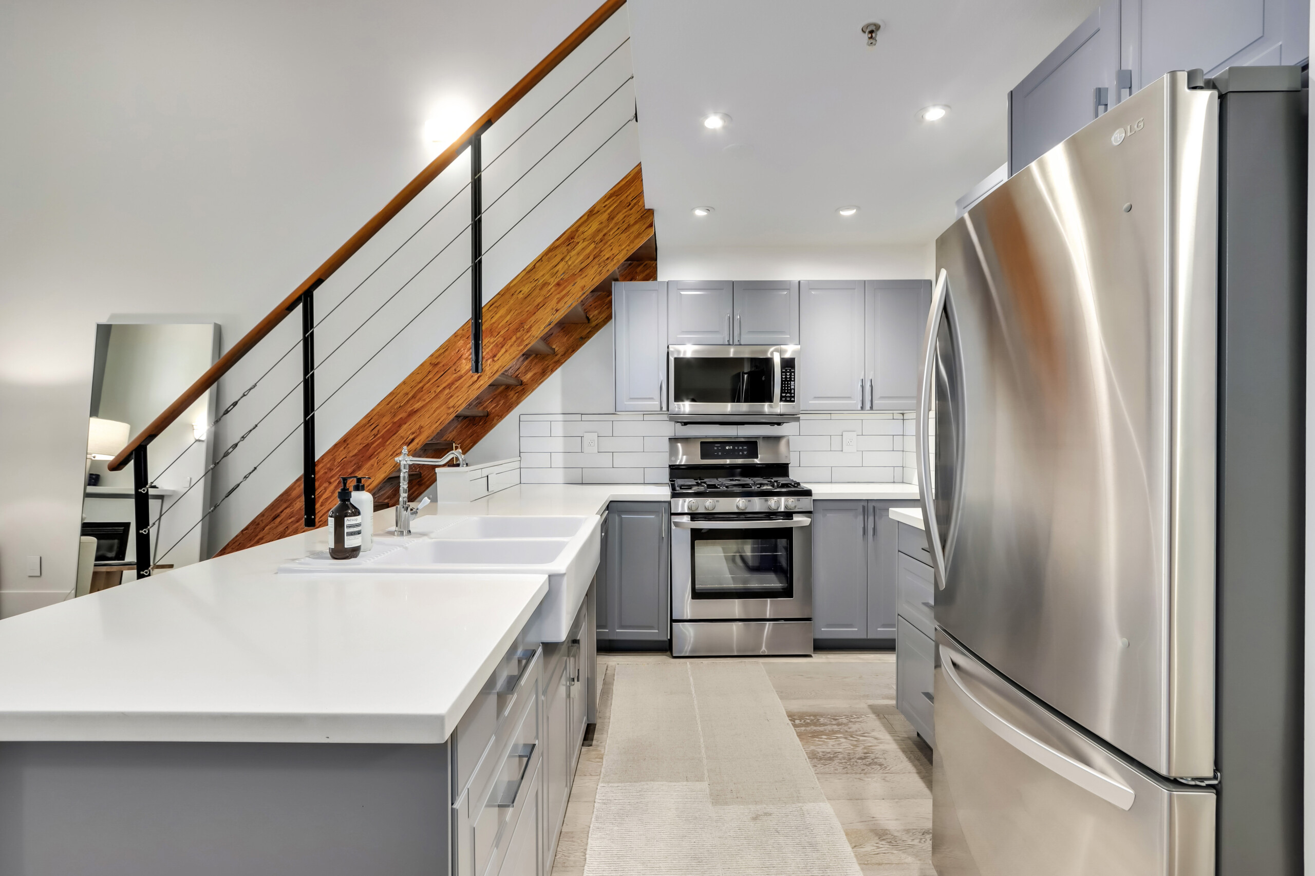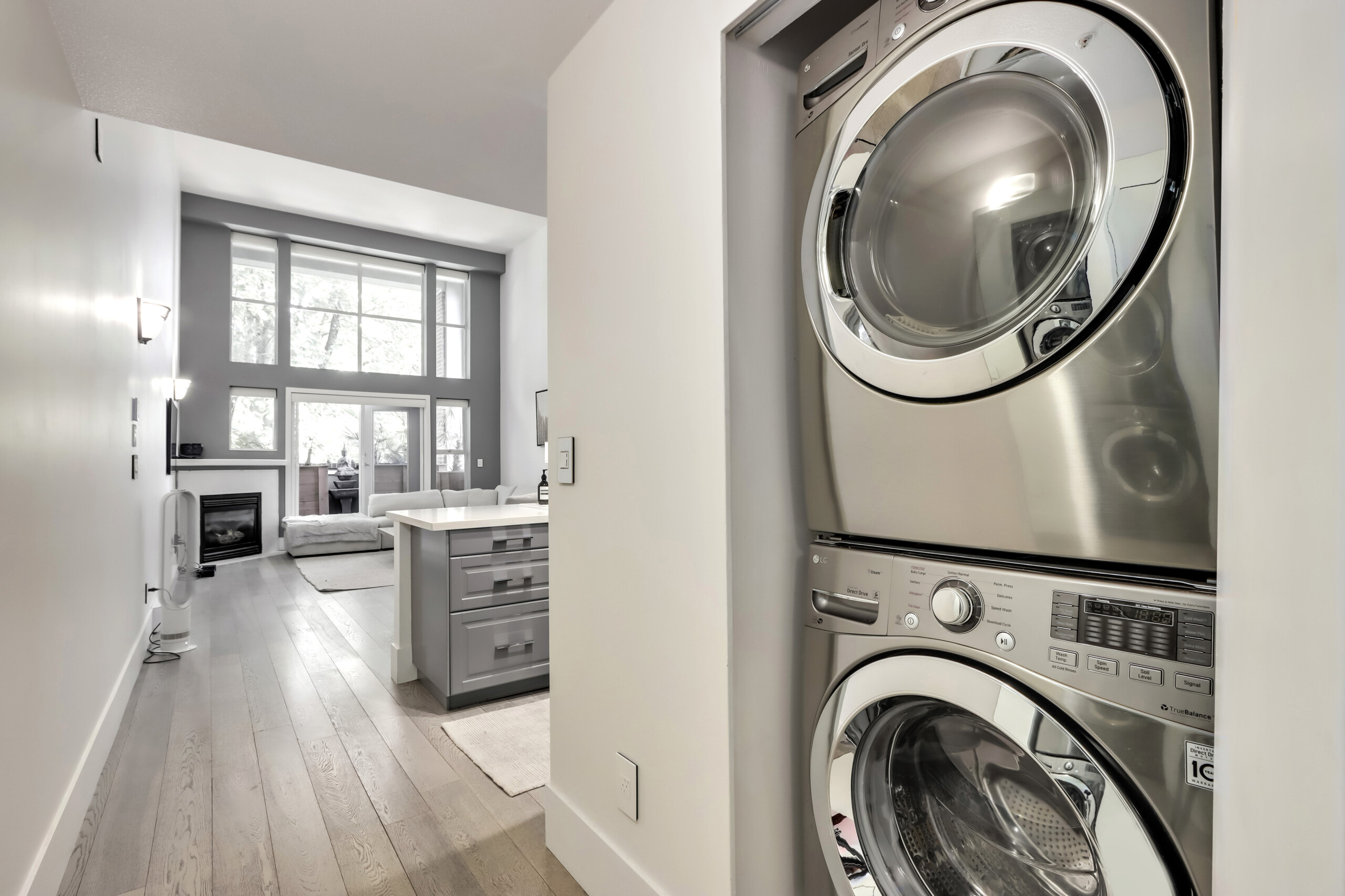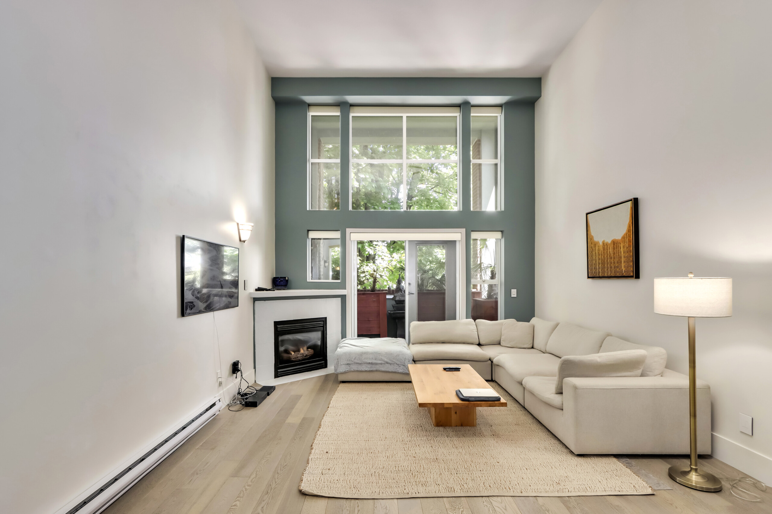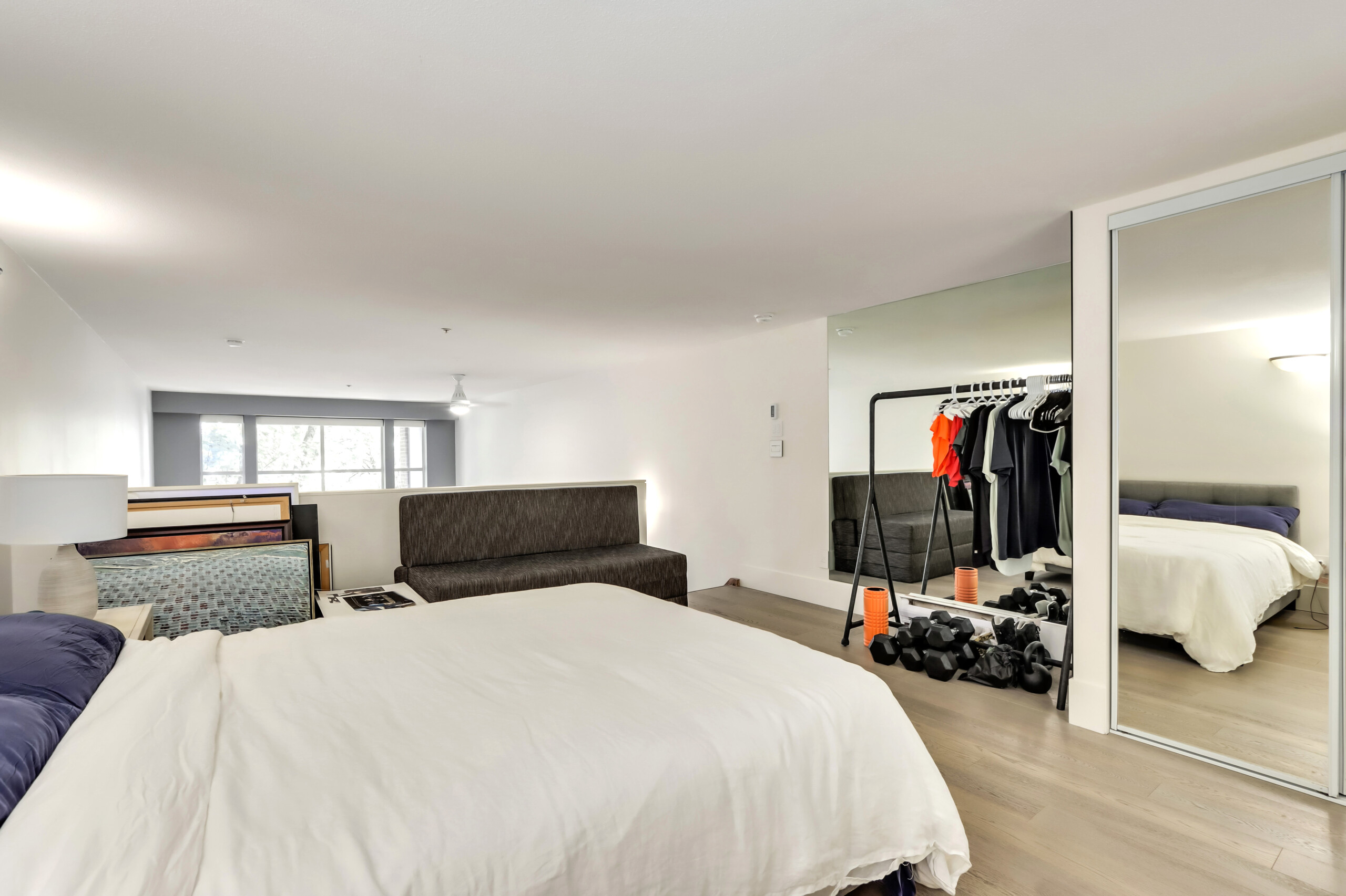 Features in this unique loft space include soaring 16’ ceilings, large living space, cozy gas fireplace, king-sized loft bedroom with 2 closets and powder room, modern open plan kitchen with ample storage space and new countertops, stainless steel appliances including: Fridge, stove, over-range microwave, and dishwasher, large pantry space, private patio with planters and small Buddha fountain, and in-suite washer & dryer