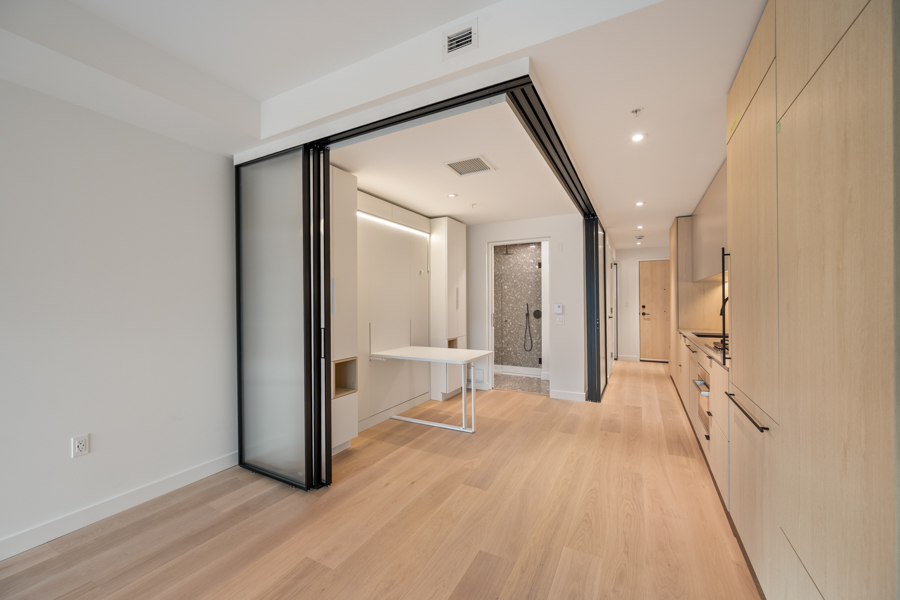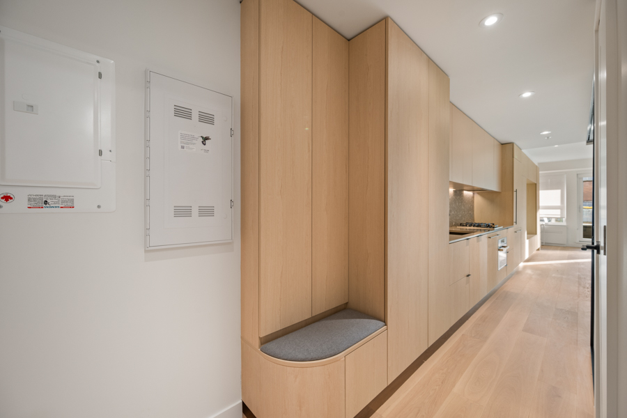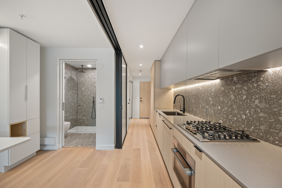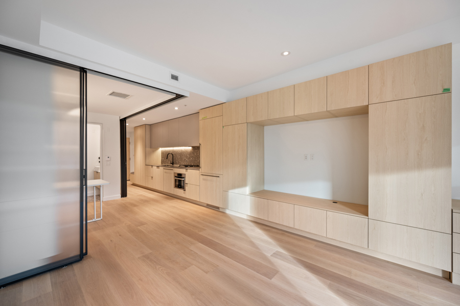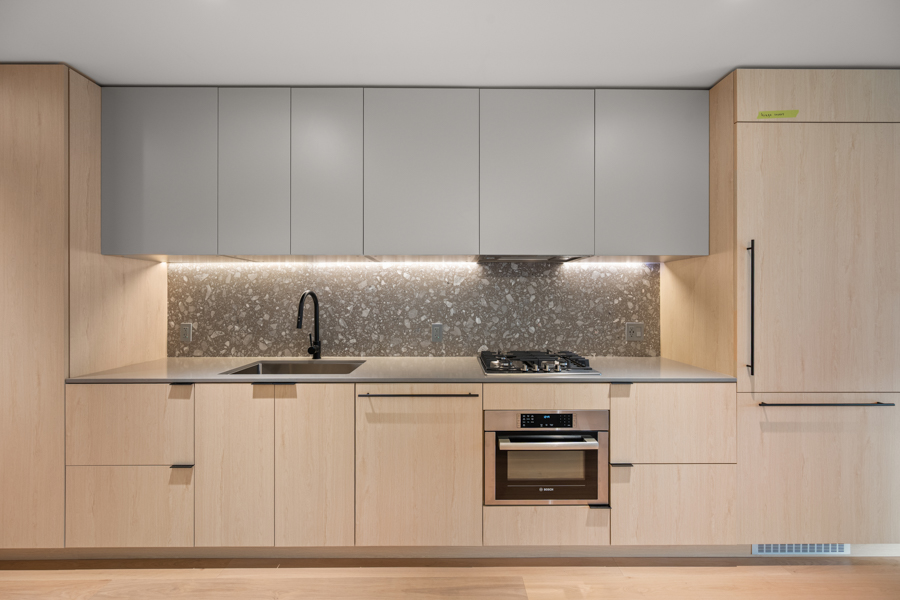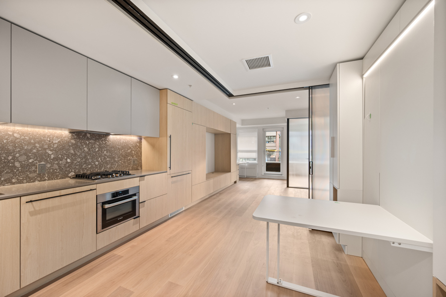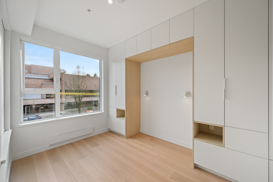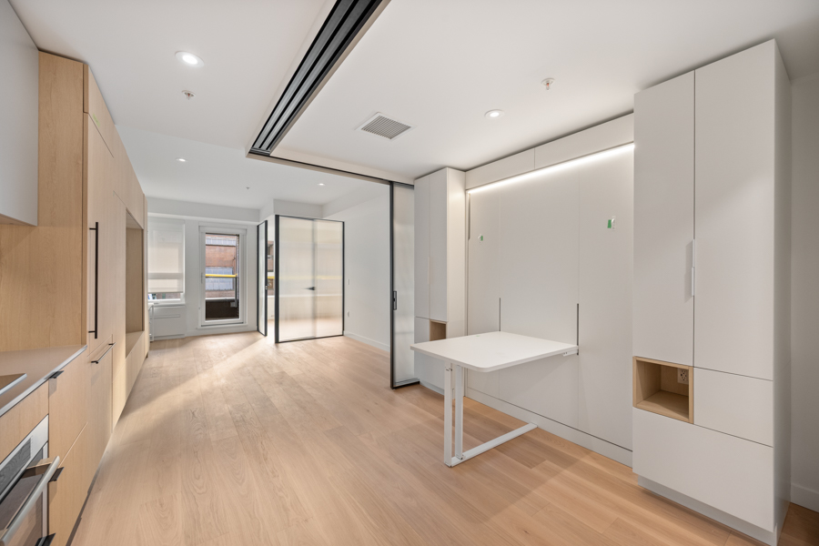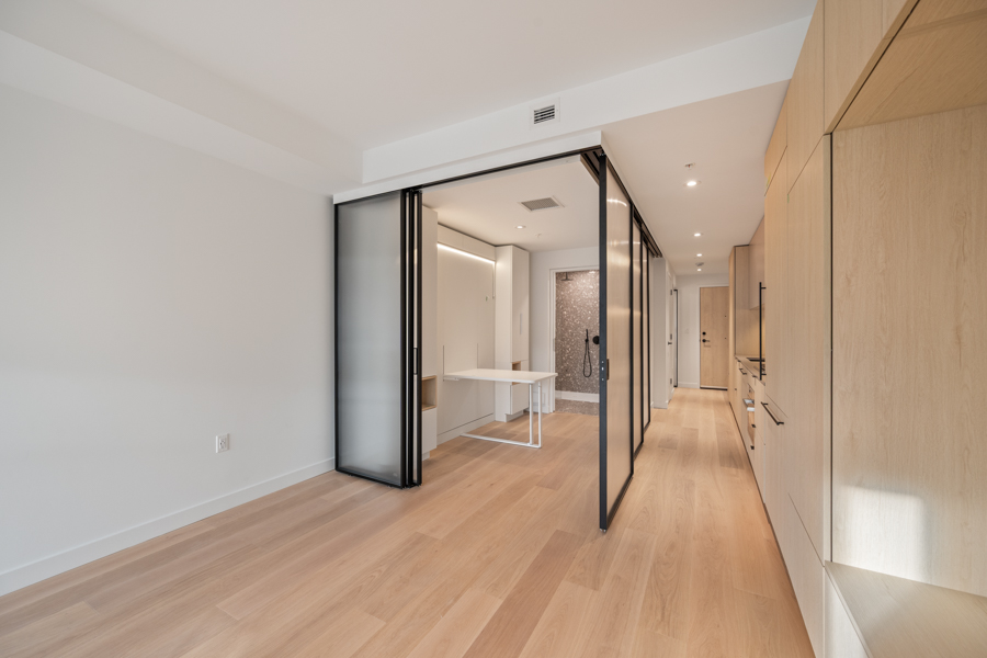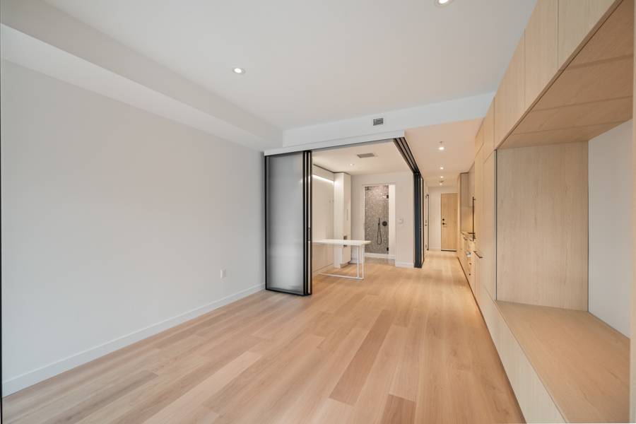 Features in this brand new Jr. 2 bedroom include custom designed millwork throughout with transitional furniture, integrated cabinetry and built in office. Entertainment and closet-depth storage millwork. Frosted sliding glass walls, for privacy, that stack discretely when not in use. Integrated bed system that transforms from a bed with built in lighting and storage into a dining area with table. ‘Smart Home’ features including smart plugs. USB plugs and selected lighting control. Modern open kitchen with pantry and integrated and stainless steel Bosch and Blomberg appliances: Fridge, Oven, Gas Range, and Dishwasher. Main Bedroom has integrated millwork closets with ample storage. Central air-conditioning. 9’ ceilings, Private Covered Balcony, and In-suite washer and dryer