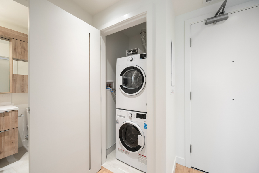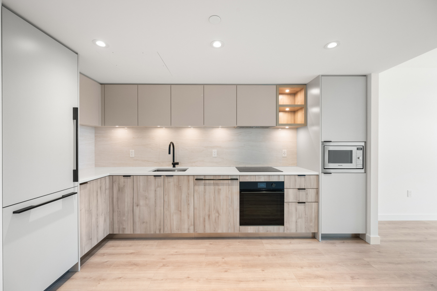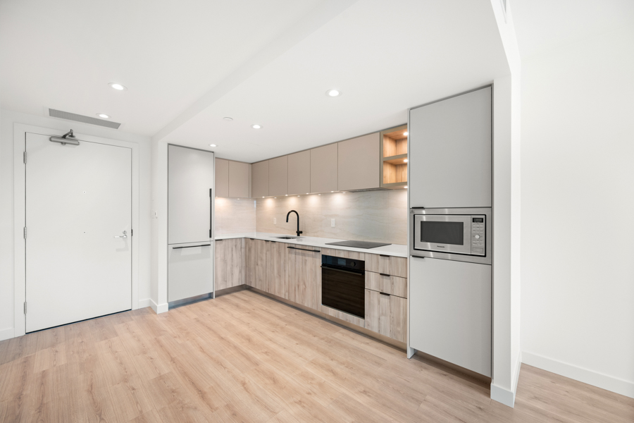 Features in this 3rd floor unit include stylish flat panel cabinetry with Italian porcelain tile backsplashes, and undermount lighting, a Fisher & Paykel appliance package with stainless steel and integrated appliances: fridge, glass cook top, oven, dishwasher, and microwave, an open concept floorplan, roller blinds on all windows with blackout blinds in the bedroom, Peek-a-boo water views from private covered balcony, and Air Conditioning. In-suite washer and dryer.