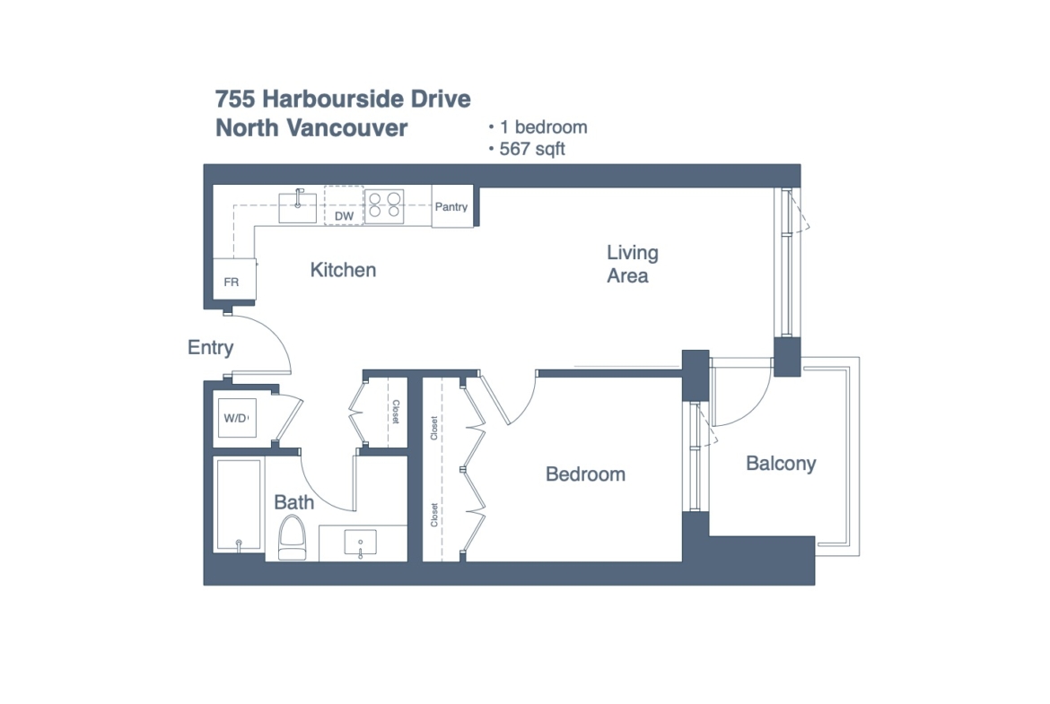 The Drift – North Harbour building is located along the waterfront in the Marine neighbourhood of the City of North Vancouver. It is a short drive to the Lonsdale Quay and is situated right along the Spirit Trail, which winds along the waterfront.