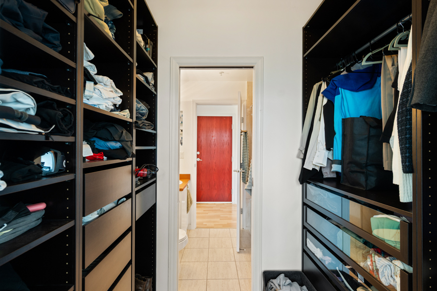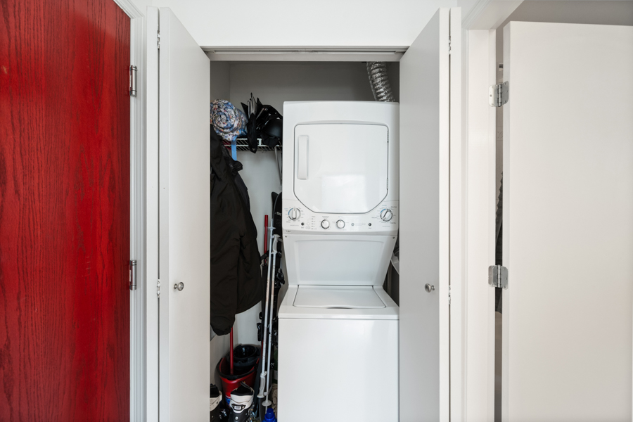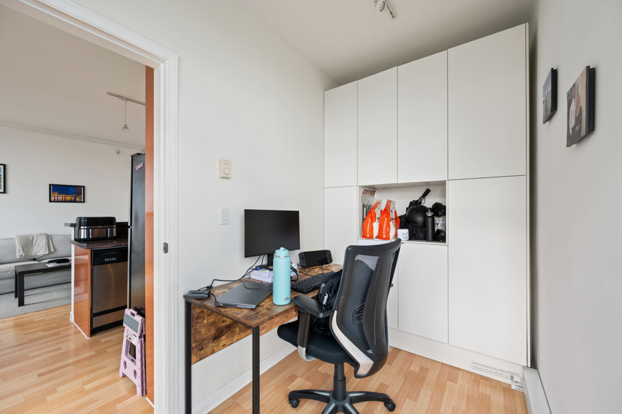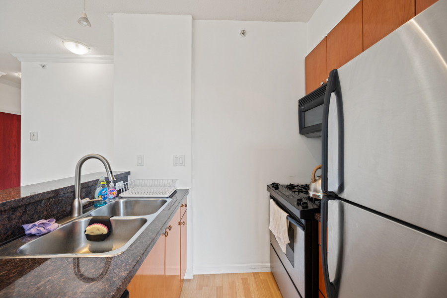 Features in this 23rd floor unit include spacious bedroom with walk-in closet, large den with built-in storage, perfect for an office, overheight ceilings, open plan kitchen with plenty of storage and granite kitchen countertop. Stainless steel fridge, stove with gas cooktop, dishwasher, and microwave. Cozy fireplace and covered small balcony perfect for a bistro set. In-suite washer and dryer.