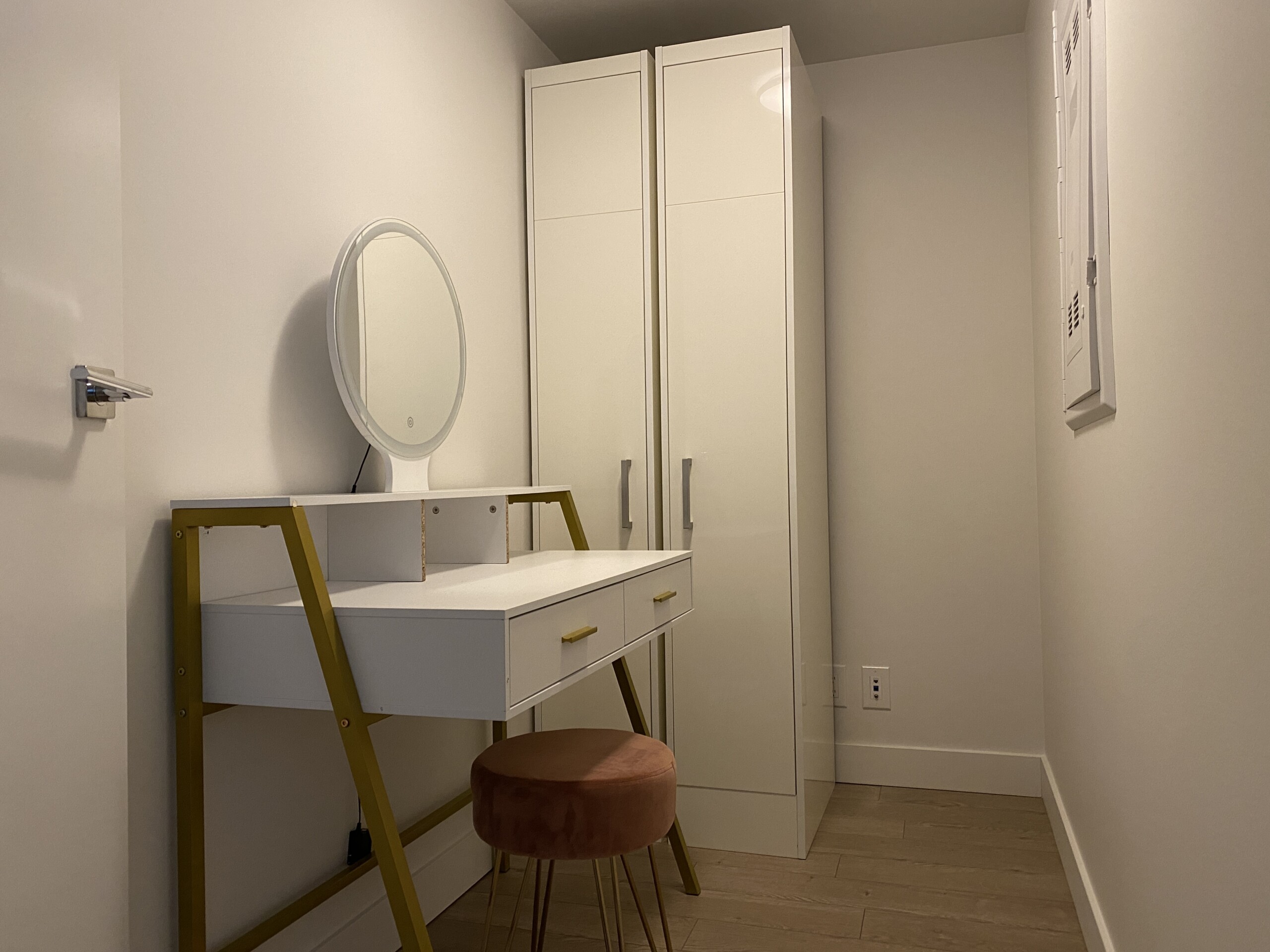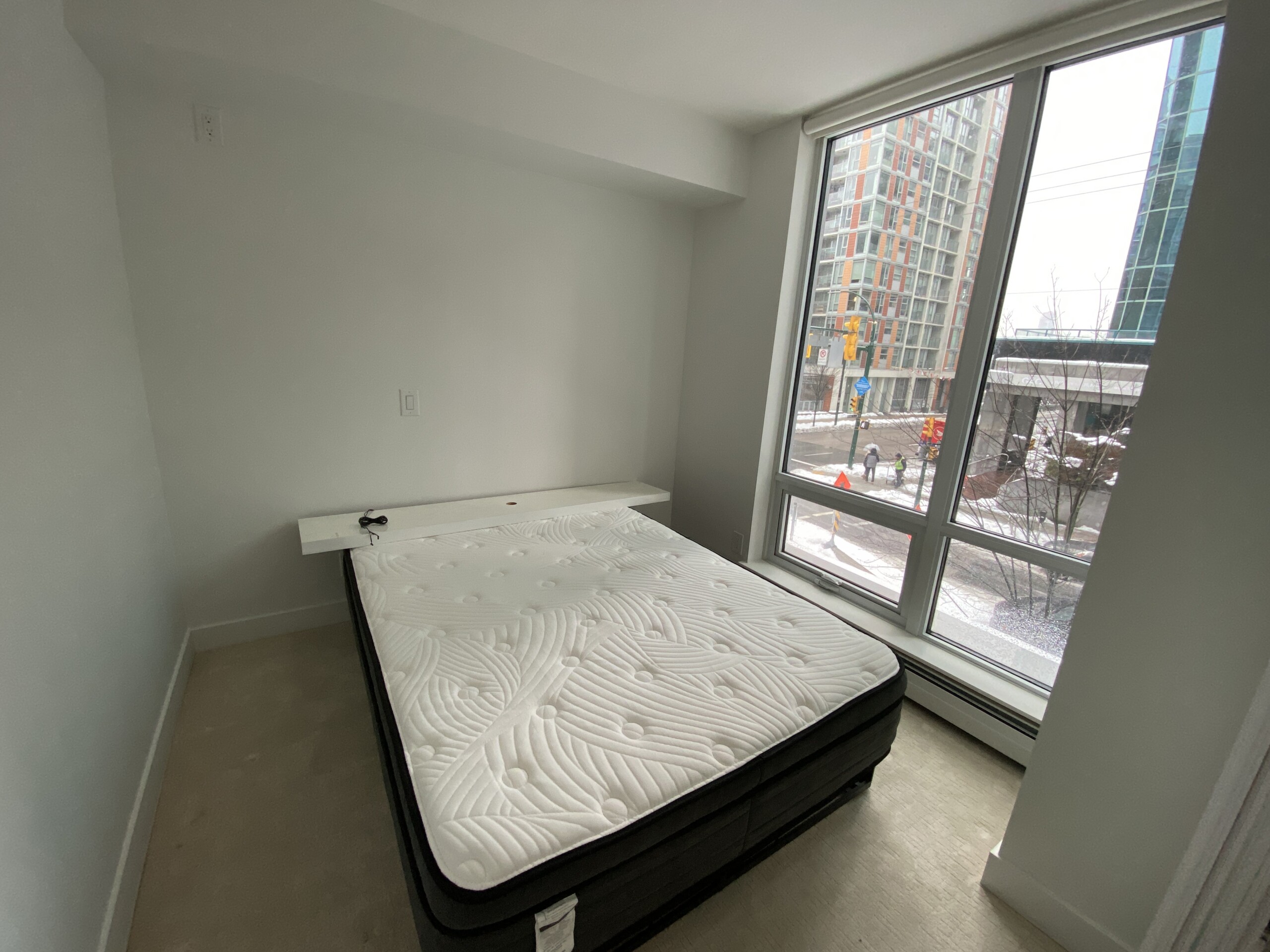 Features in this freshly painted unit include a frosted glass sliding door, wheelchair accessible bathroom, laminate flooring throughout living areas, plush carpeting in bedroom, open plan kitchen with European cabinetry system, elegant polished-edge quartz countertops, stainless steel and integrated appliances, in-suite washer and dryer, & a large flex space, perfect as an office or storage room